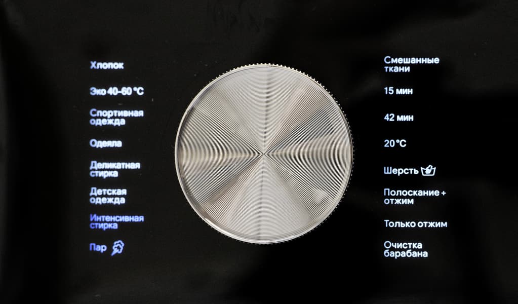 В ее центре размещен круглый селектор программ. Справа от него — цветной дисплей с сенсорными кнопками. Индикация на выключенном устройстве не видна, и мы рассмотрим ее чуть позже, когда включим машину.