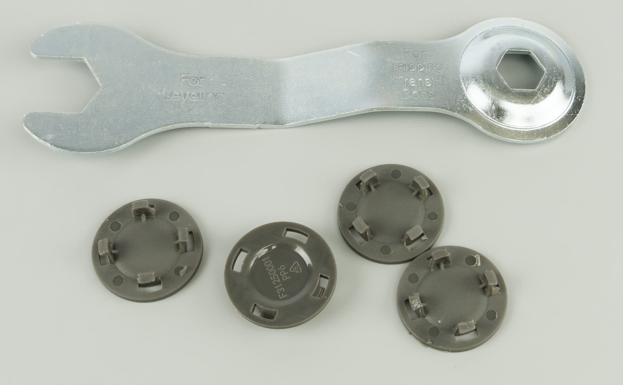 Металлический ключ предназначен для регулировки ножек устройства по высоте, а пластиковые заглушки вставляются в отверстия, оставшиеся после транспортировочных болтов.