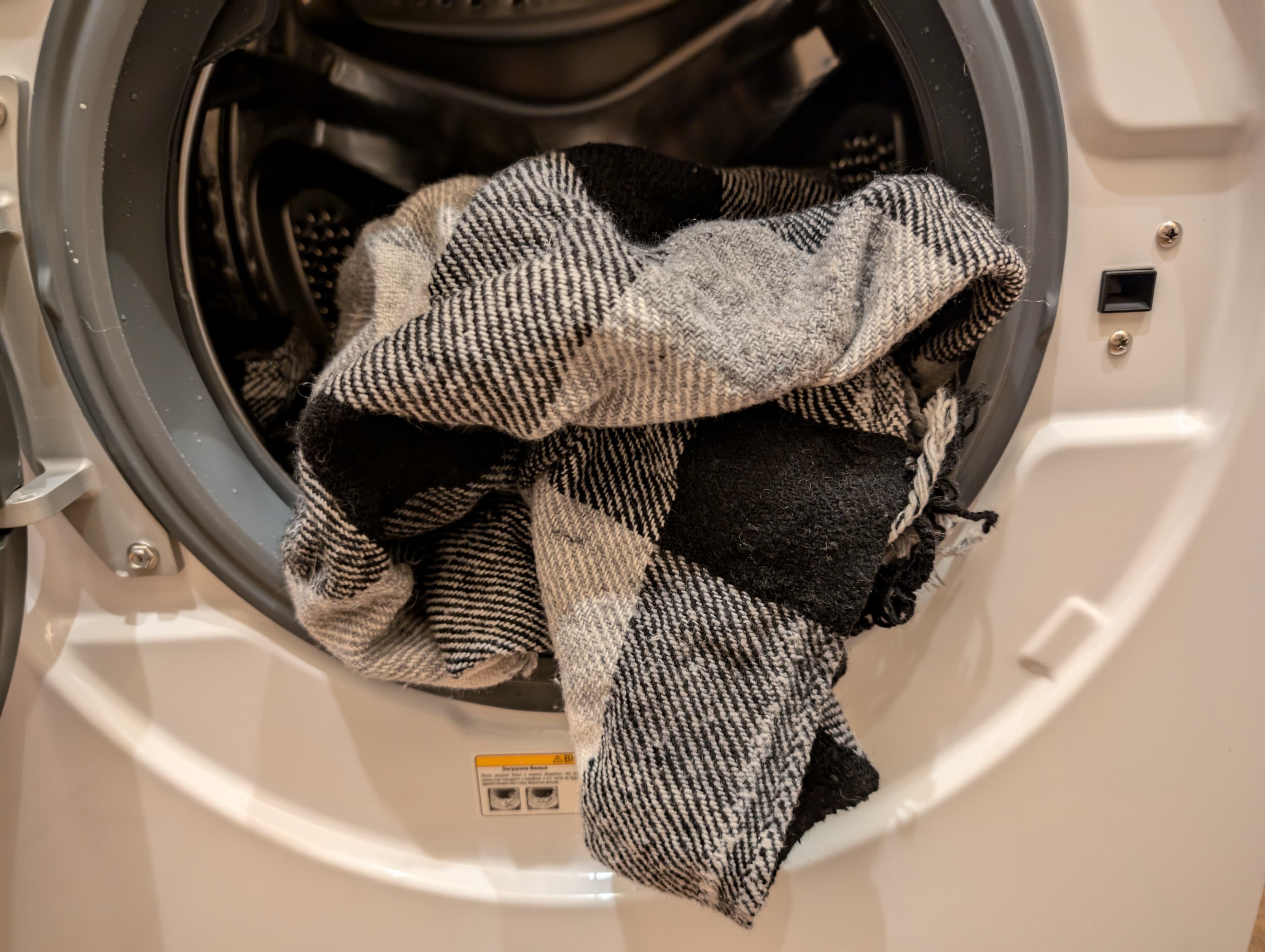 Но в жизни нам приходится стирать не только хлопок, но и более деликатные ткани. Так что еще один наш постоянный тест — стирка шерстяного пледа весом чуть меньше килограмма.