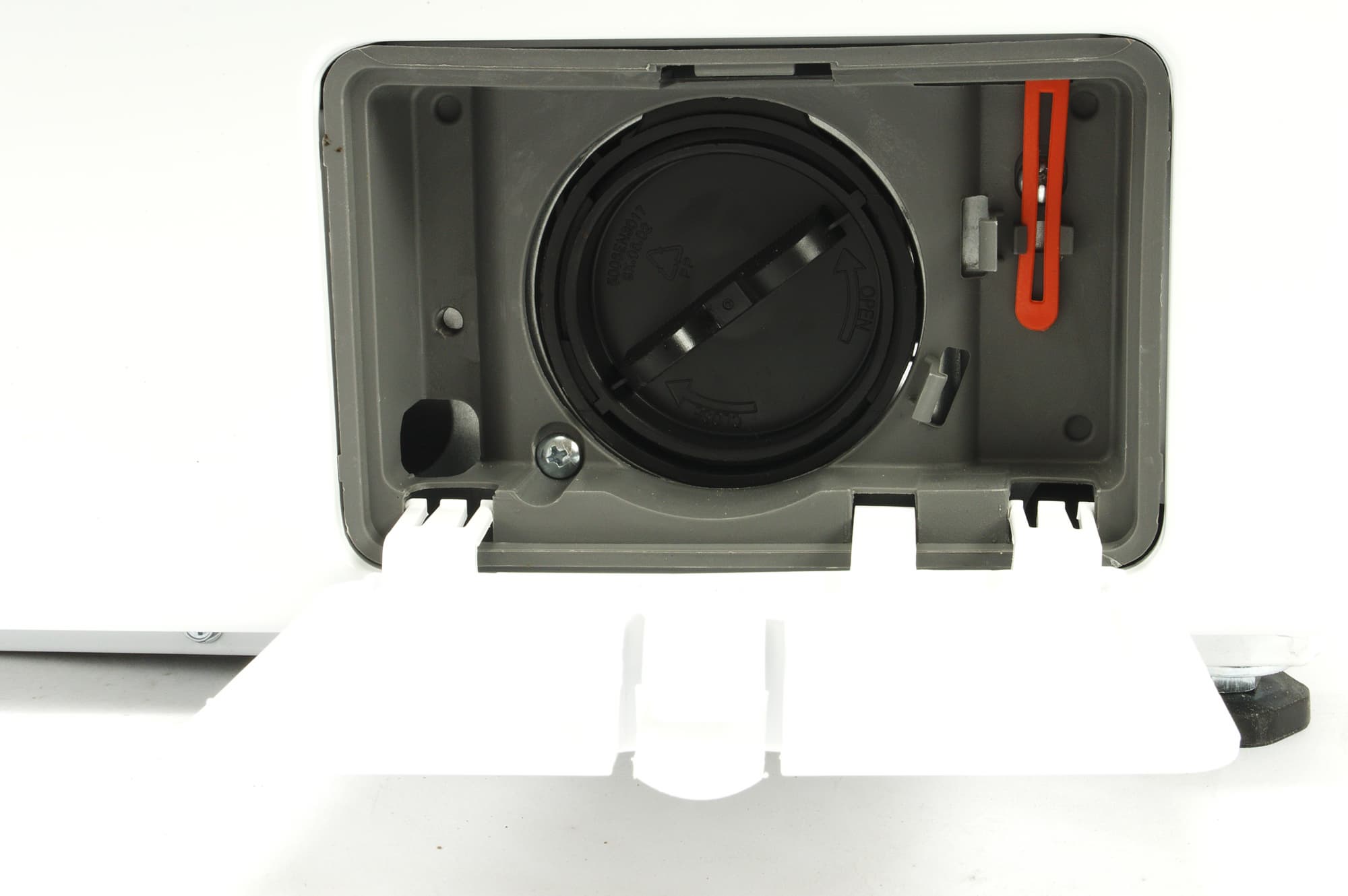 В нижнем правом углу передней панели расположен прямоугольный люк сливного фильтра с патрубком для аварийного удаления воды.