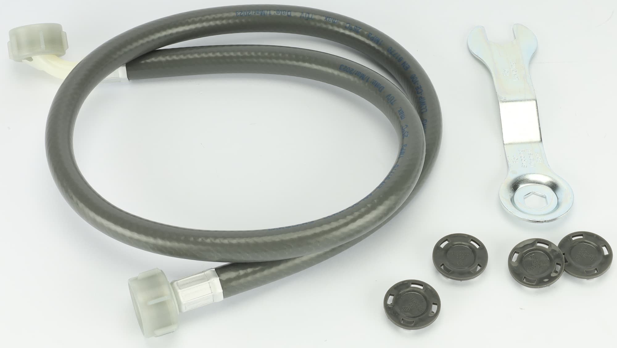 Сливной шланг уже установлен и закреплен в специальных держателях на задней панели. В левом верхнем углу расположена розетка для заливного шланга, снабженная сетчатым фильтром от ржавчины. Эта модель, как и большинство стиралок, рассчитана на подключение только к холодному водоснабжению.