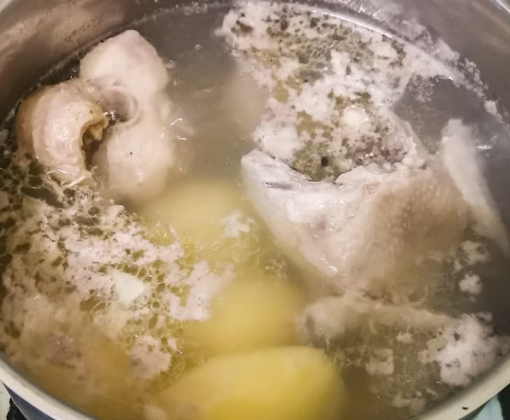 Для супа мы взяли обычный репчатый лук, заменив им порей, картошку, курицу, сливки, зелень, оливковое масло.