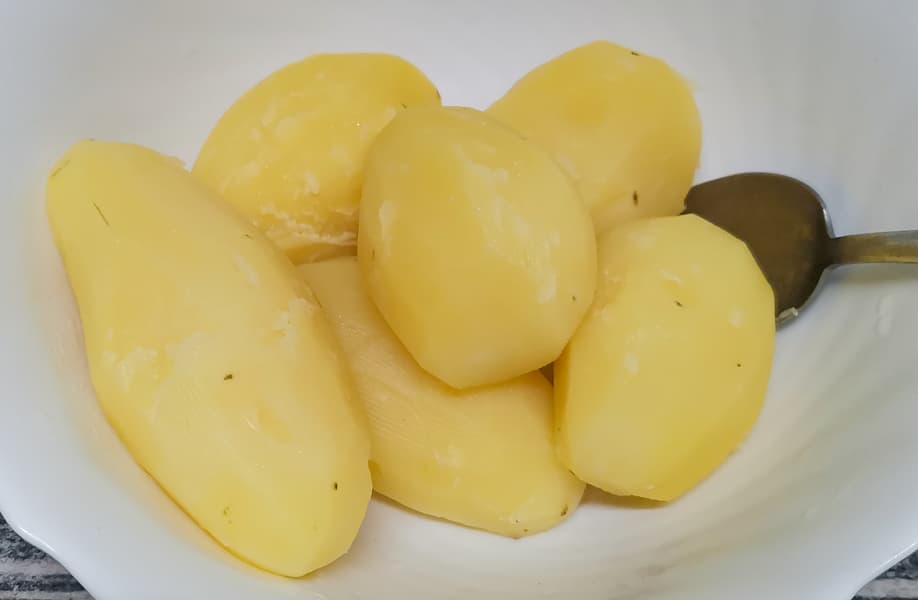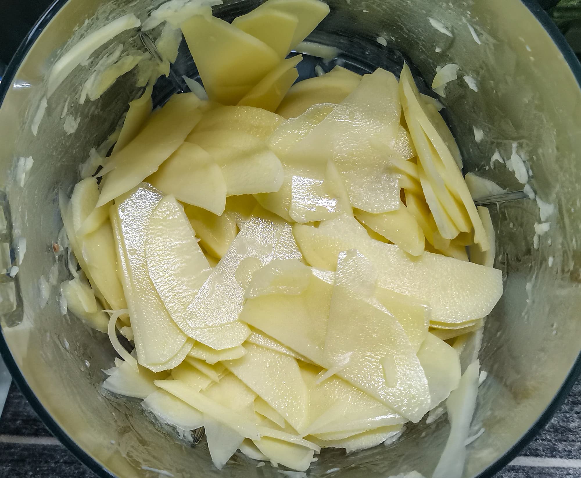 Молодую очищенную картошку мы порезали пополам так, чтобы она проходила в отверстие крышки кухонного комбайна. С помощью тонкой шинковки всего за несколько секунд нарезали тонкие слайсы.