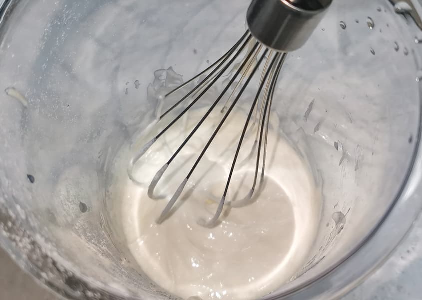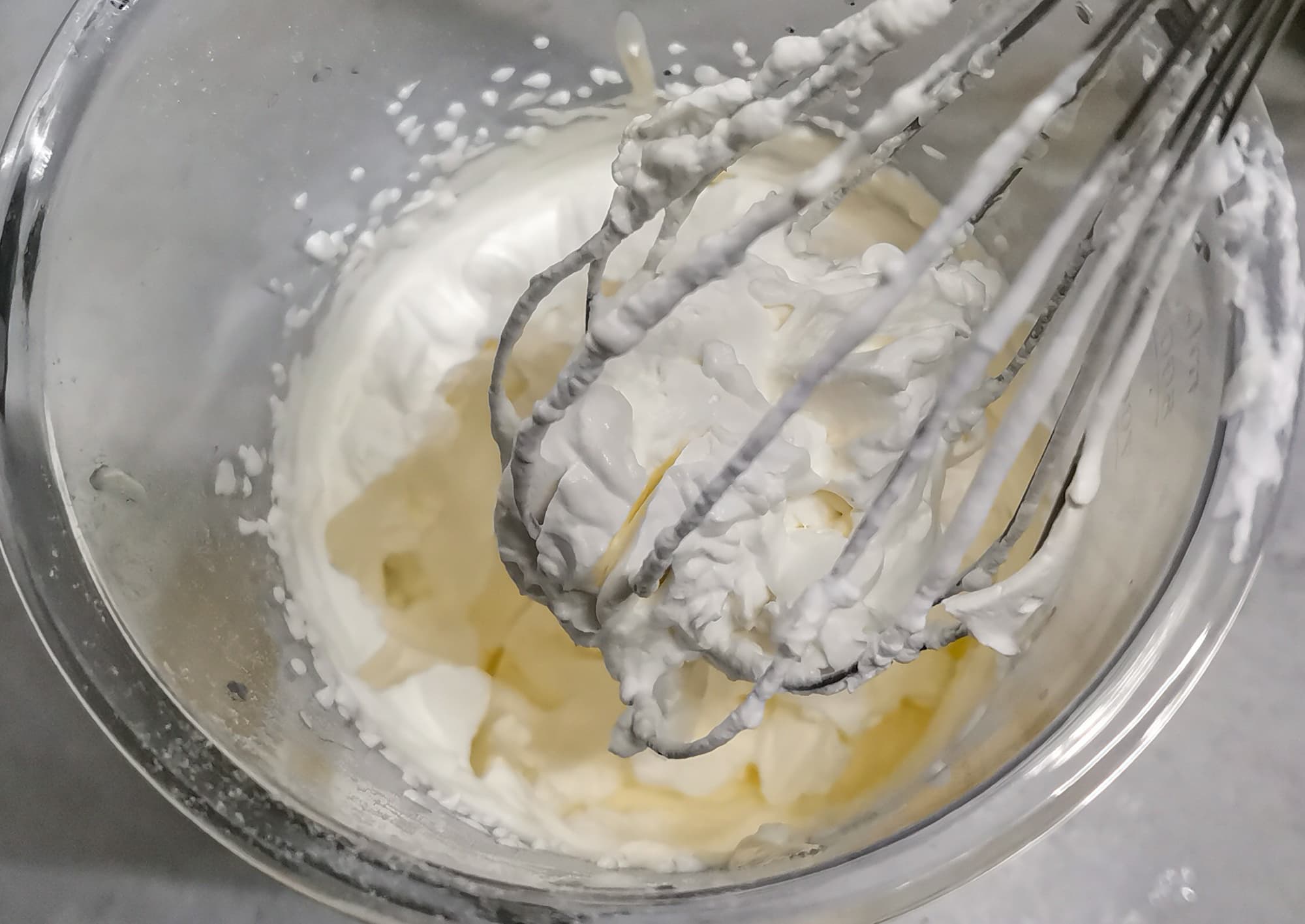 Взбивали венчиком примерно минуту сначала на средней, потом на высокой скорости.