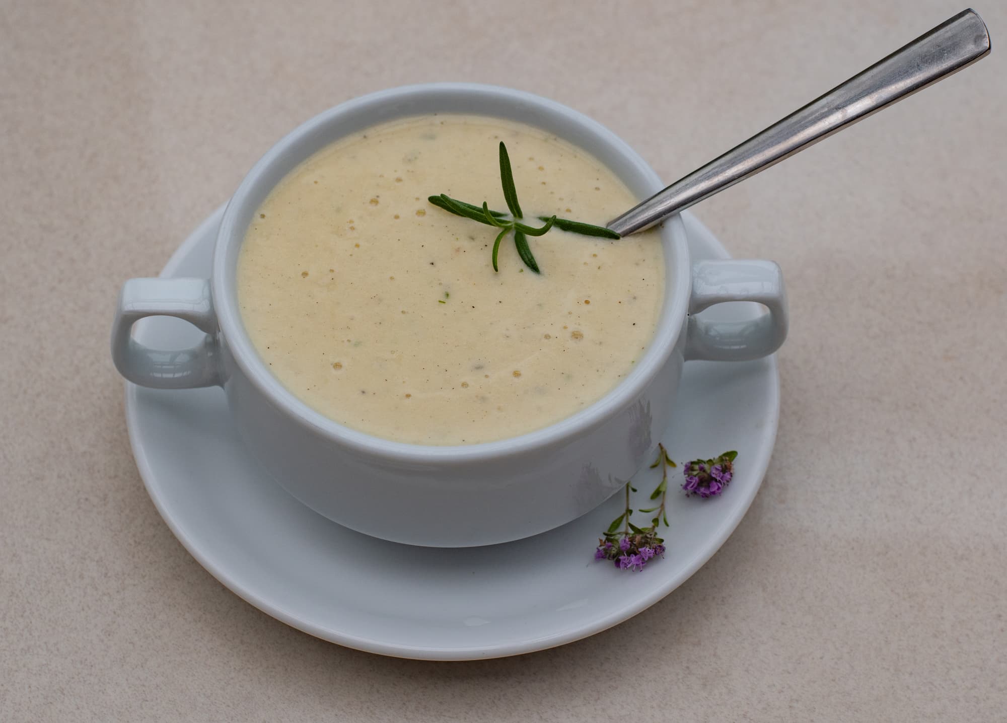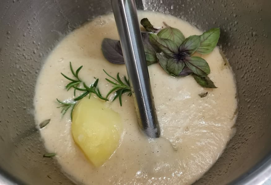 Добавили еще картошки, сливок, бульона, розмарин и базилик. Пробили блендером до однородности. На это ушло около 1-1,5 минуты при средней скорости.