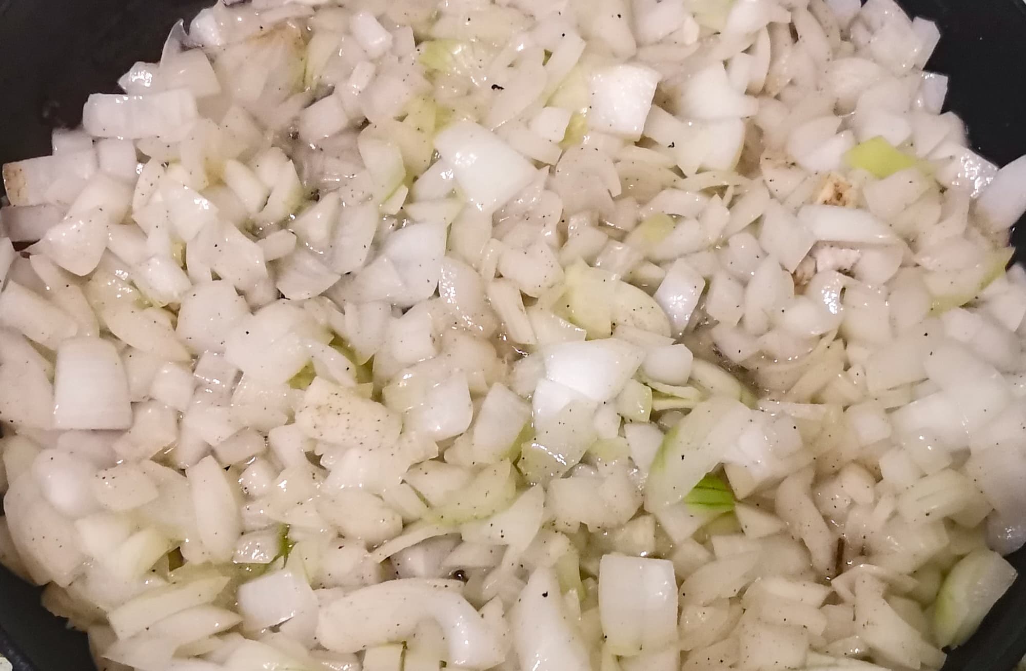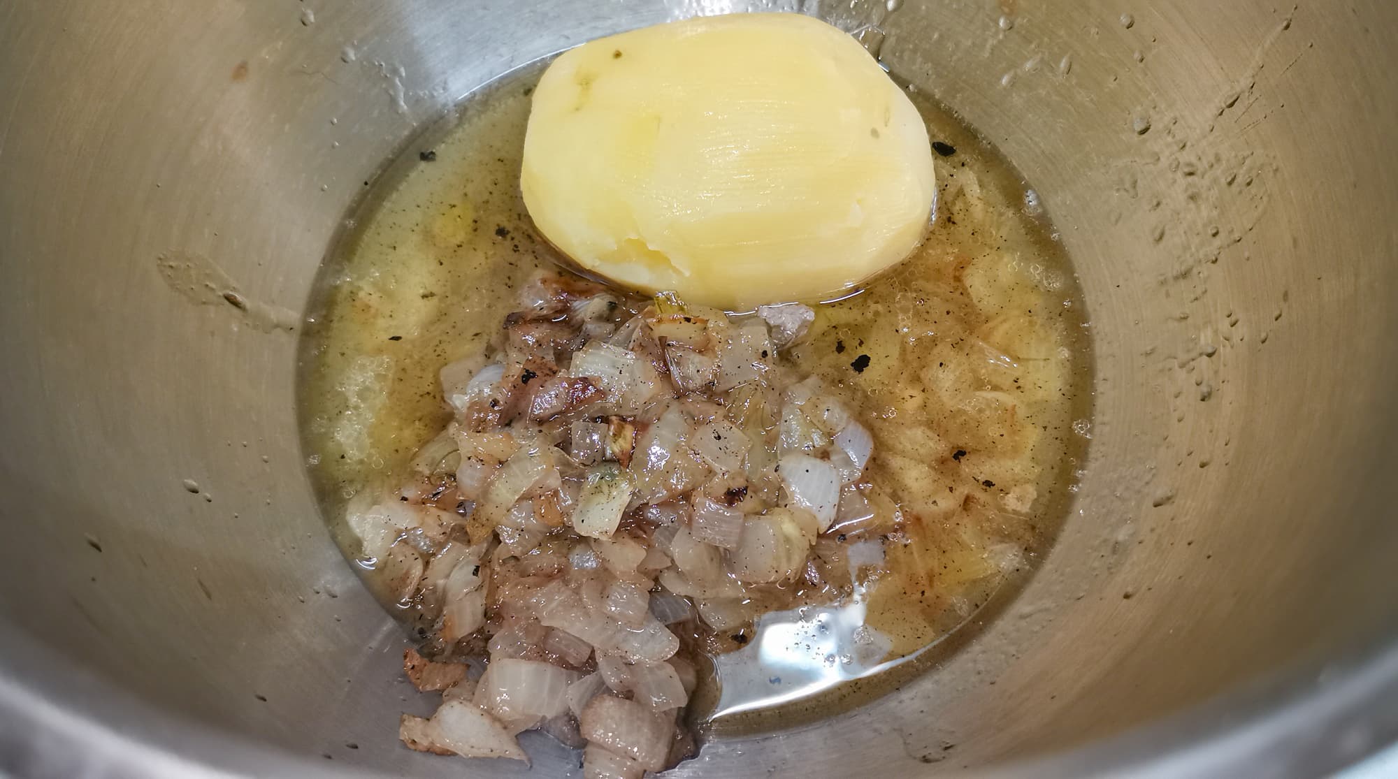 Измельчили лук и картофель насадкой-блендером до однородности.
