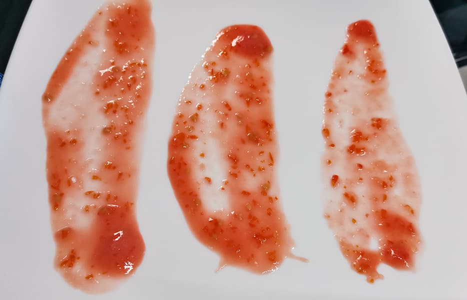 Прокрутили в течение трех циклов по 30 секунд. Масса измельчилась неплохо, но отдельные фрагменты кожицы и неперемолотые семечки все-таки встречались. На фото справа — результат измельчения за 30 секунд, посередине — за минуту, слева — за полторы минуты.