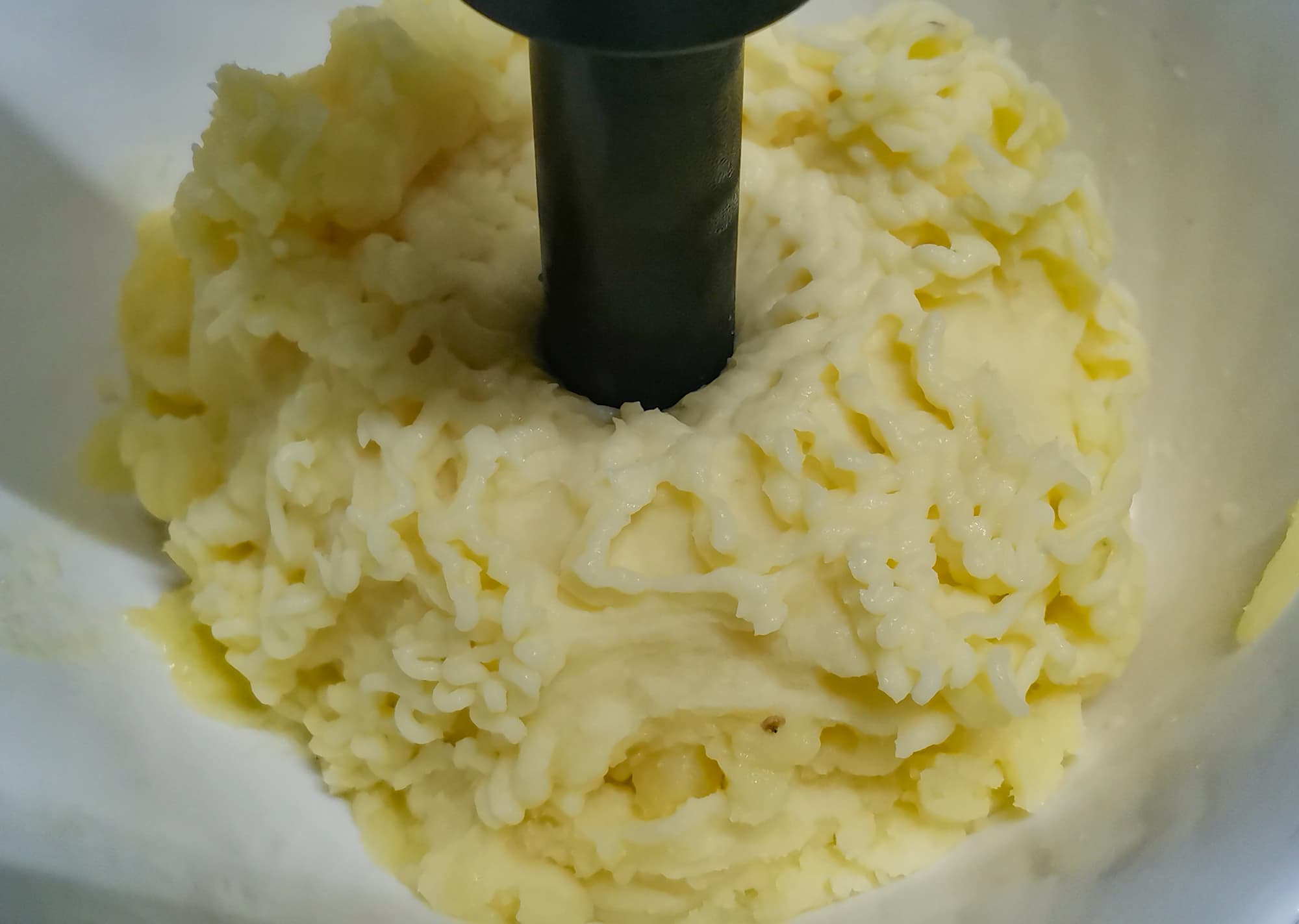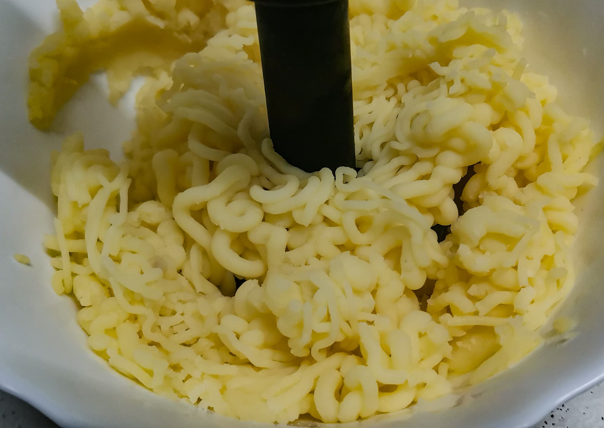 Пластиковая насадка-блендер для пюре прекрасно справляется с вареной картошкой. Пюре вылезает из насадки через отверстия, не допуская образование воздушных карманов, которые обычно мешают измельчению в подобных конструкциях.