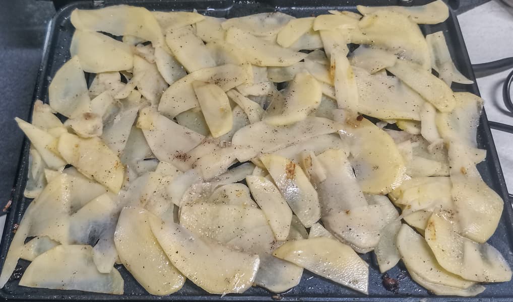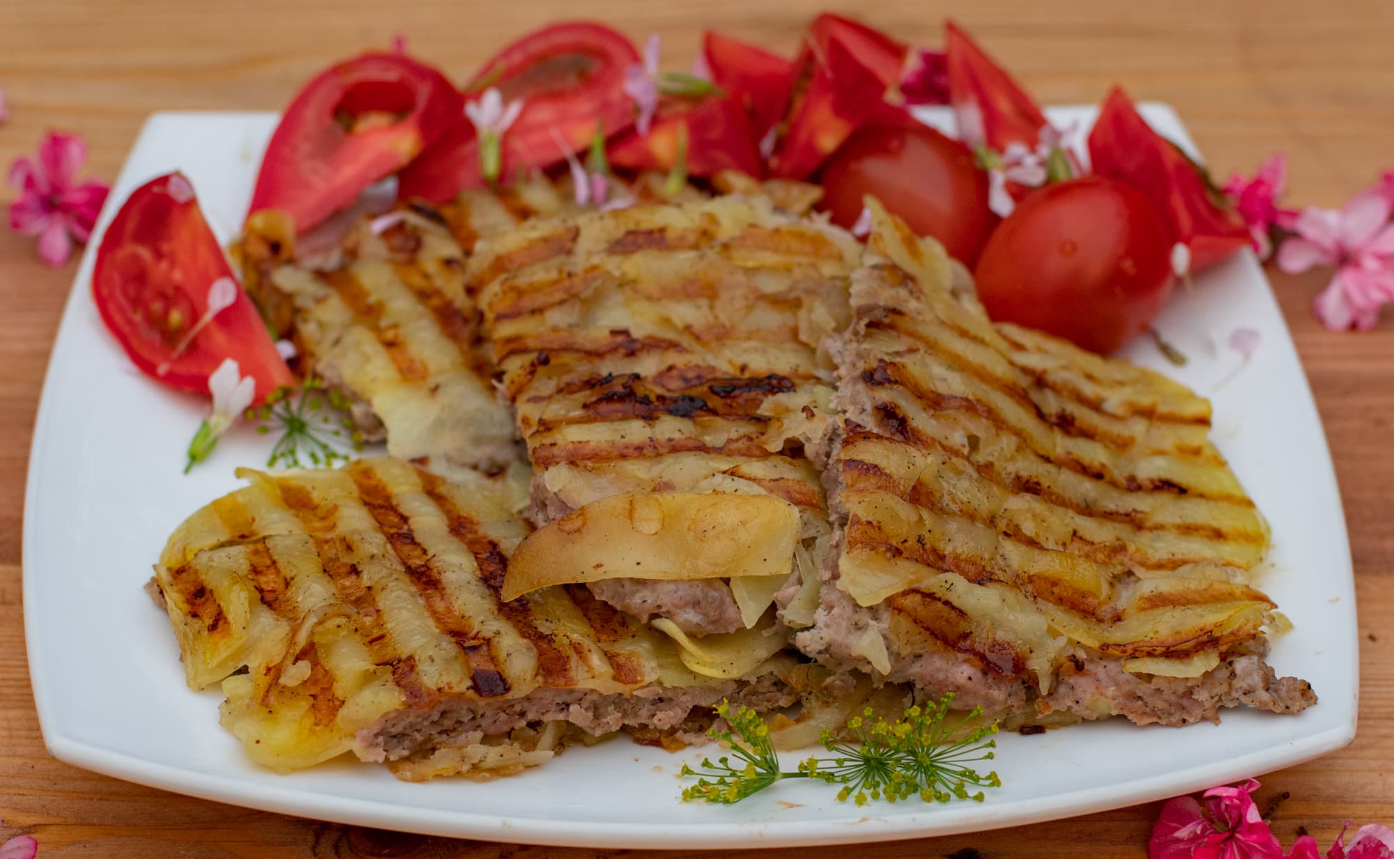Разложили картошку на гриле, прослоили фаршем, накрыли вторым слоем картошки.
