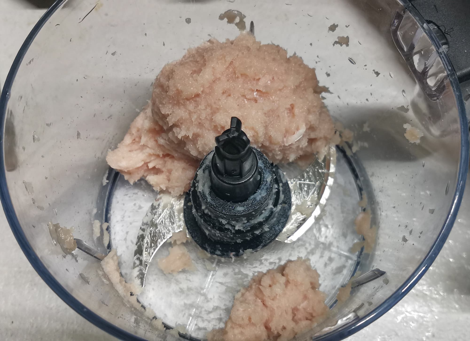 Измельчали на средней скорости в течение 1 минуты. Масса получилась хорошо перемолотой, однородной, вязкой.