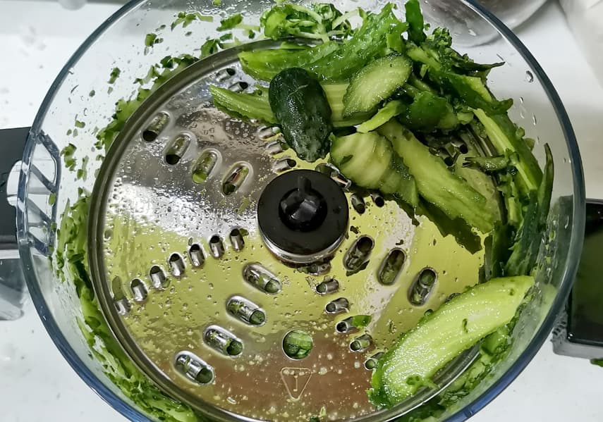 После окончания на терке остались кусочки неперетертых огурцов, которые проскочили по диску. Но если снимать диск аккуратно, они не попадают в общую массу.