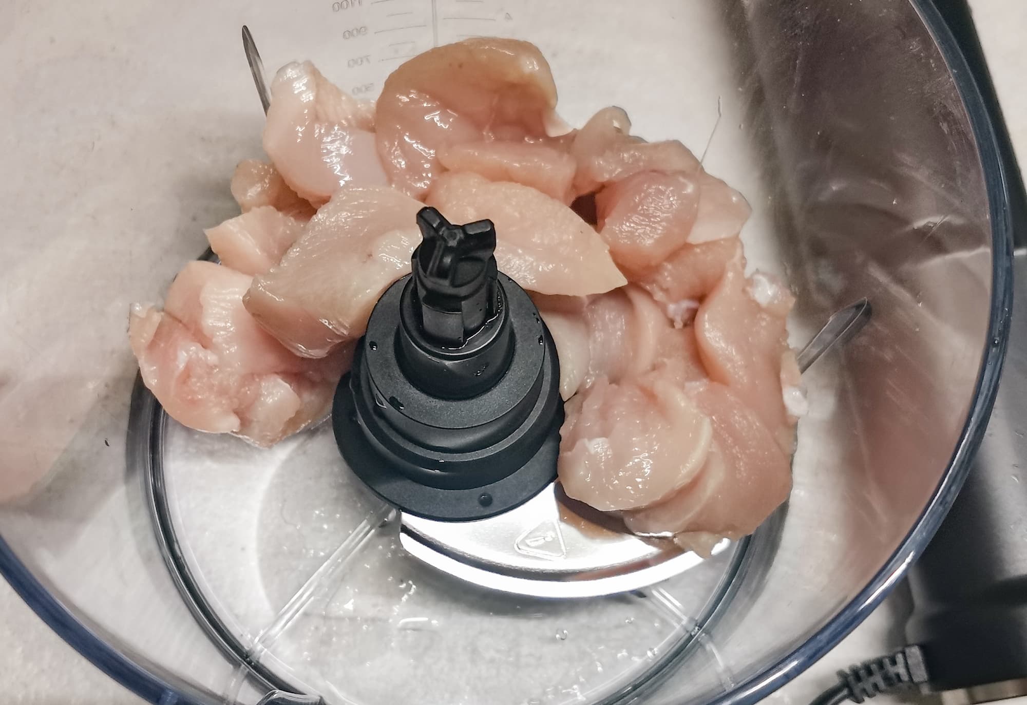 Мы взяли приблизительно 400 г куриной грудки, порезали крупными кусками, положили в емкость.