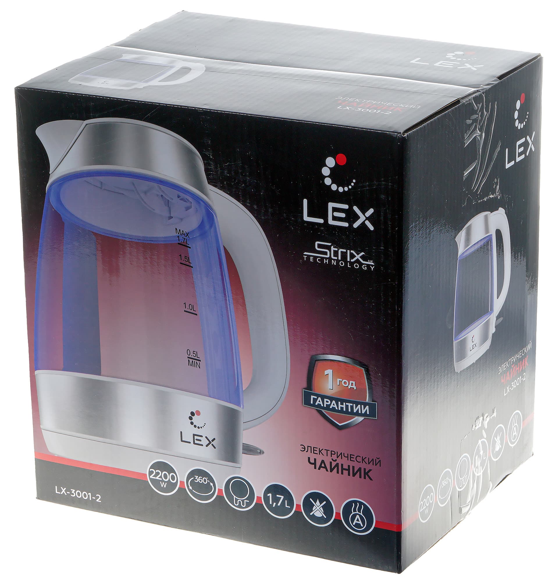 Чайник поставляется в картонной коробке, оформленной в фирменном стиле LEX. Изучив коробку, мы можем увидеть фотографии устройства, а также ознакомиться с его основными техническими характеристиками и особенностями.