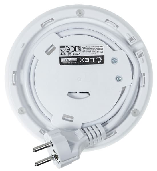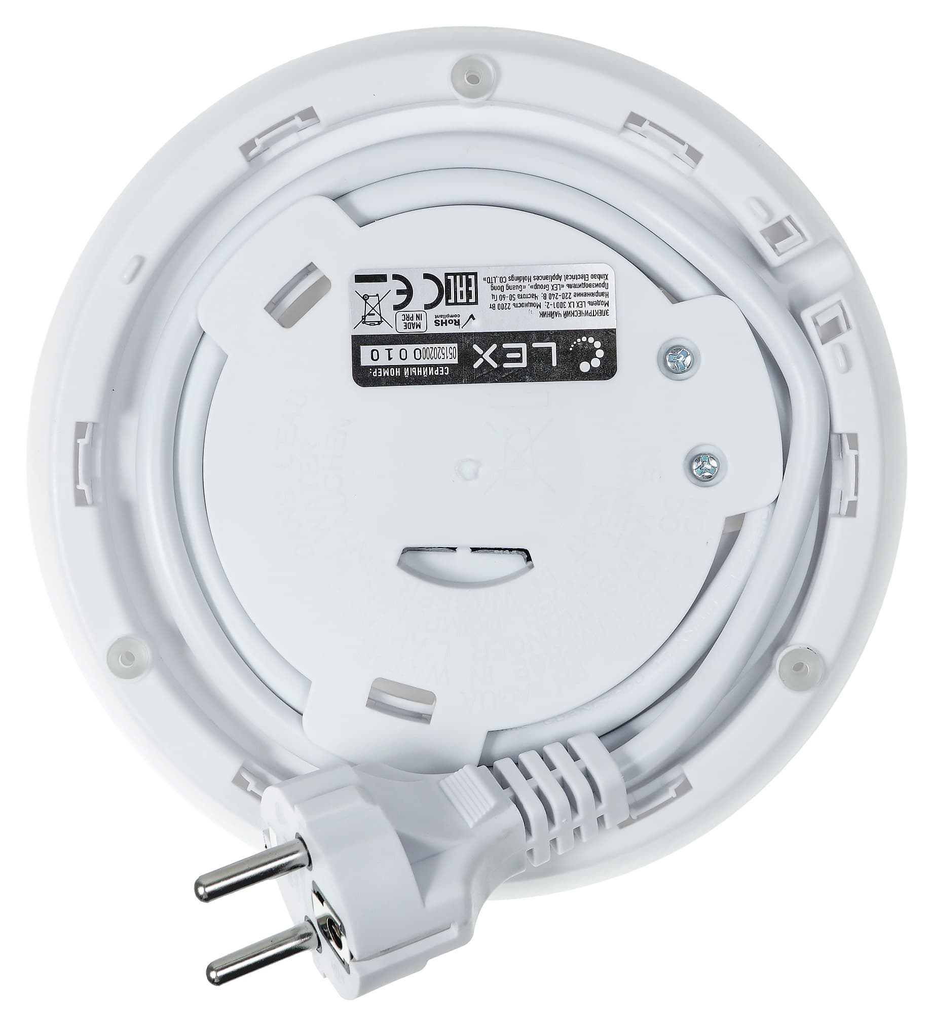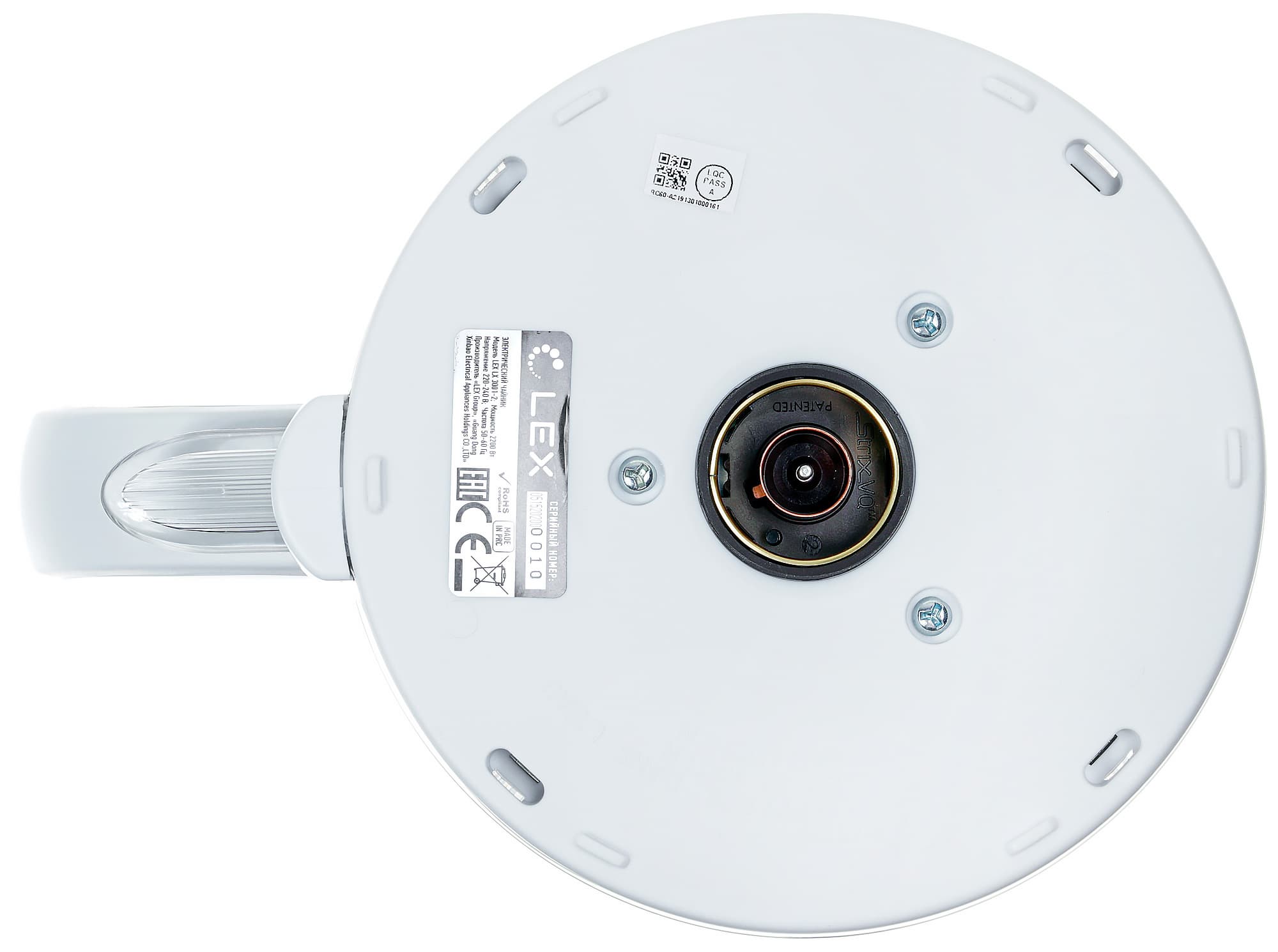 Сам прибор сделан из точно такого же белого матового пластика. В качестве дизайнерского элемента присутствуют металлические вставки — сверху, снизу и на крышке. На нижней металлической вставке нанесен логотип Lex.