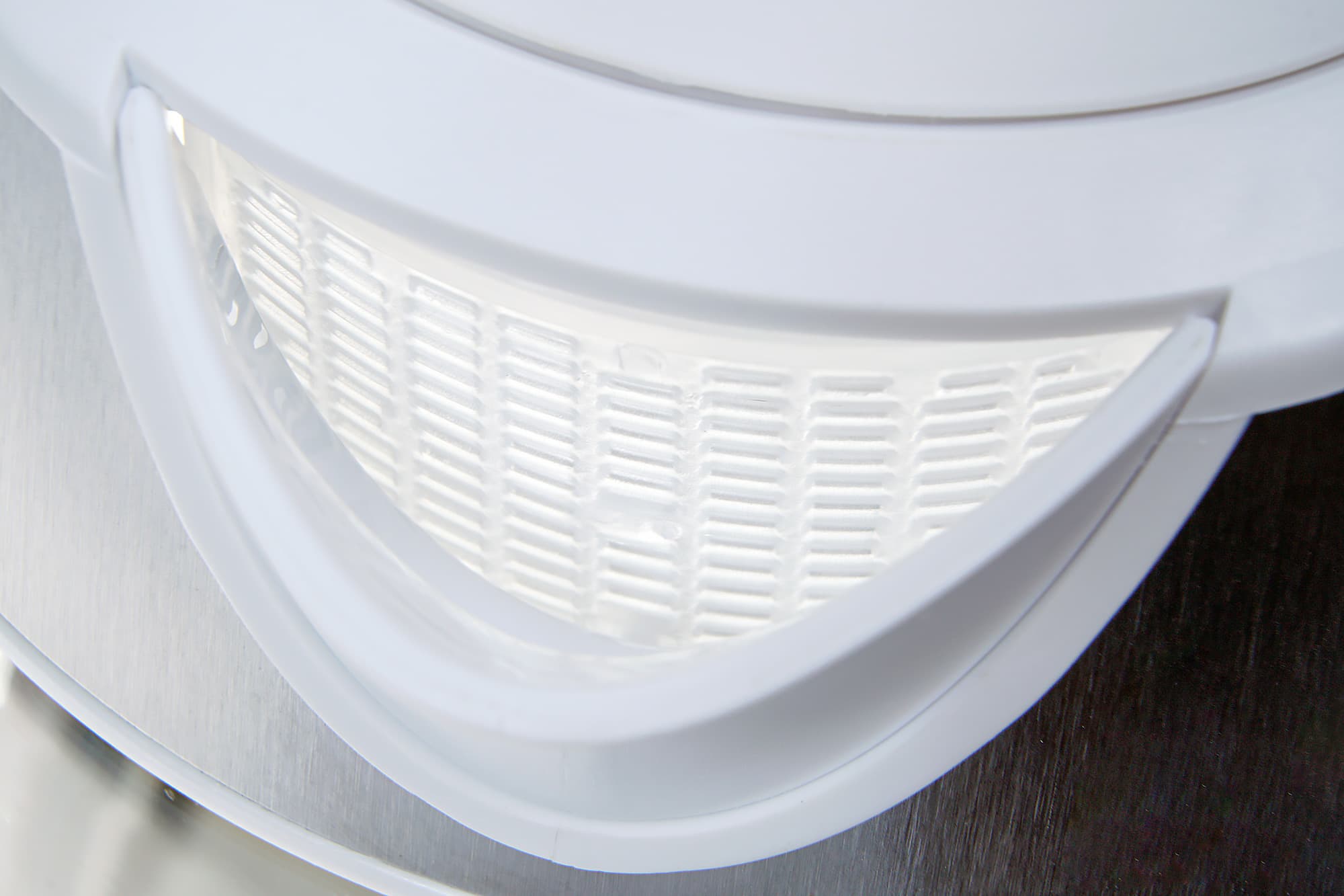 Закрывать крышку придется вручную. Открыв крышку и заглянув внутрь, можно увидеть ленту светодиодной подсветки (на дне колбы), а также пластиковый фильтр-сеточку рядом с носиком.