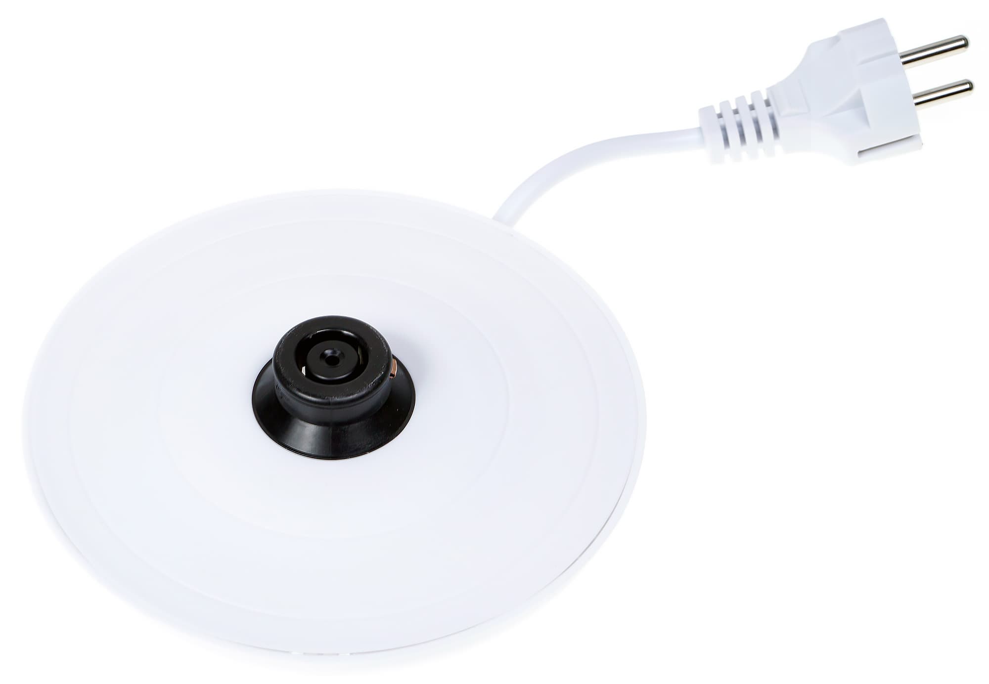 При знакомстве с чайником у нас сложилось впечатление, что перед нами — простой прибор, рассчитанный на самых обычных пользователей. Перед нами предстал «просто чайник» в симпатичном корпусе из белого пластика с металлическими вставками. Давайте взглянем на него поближе.