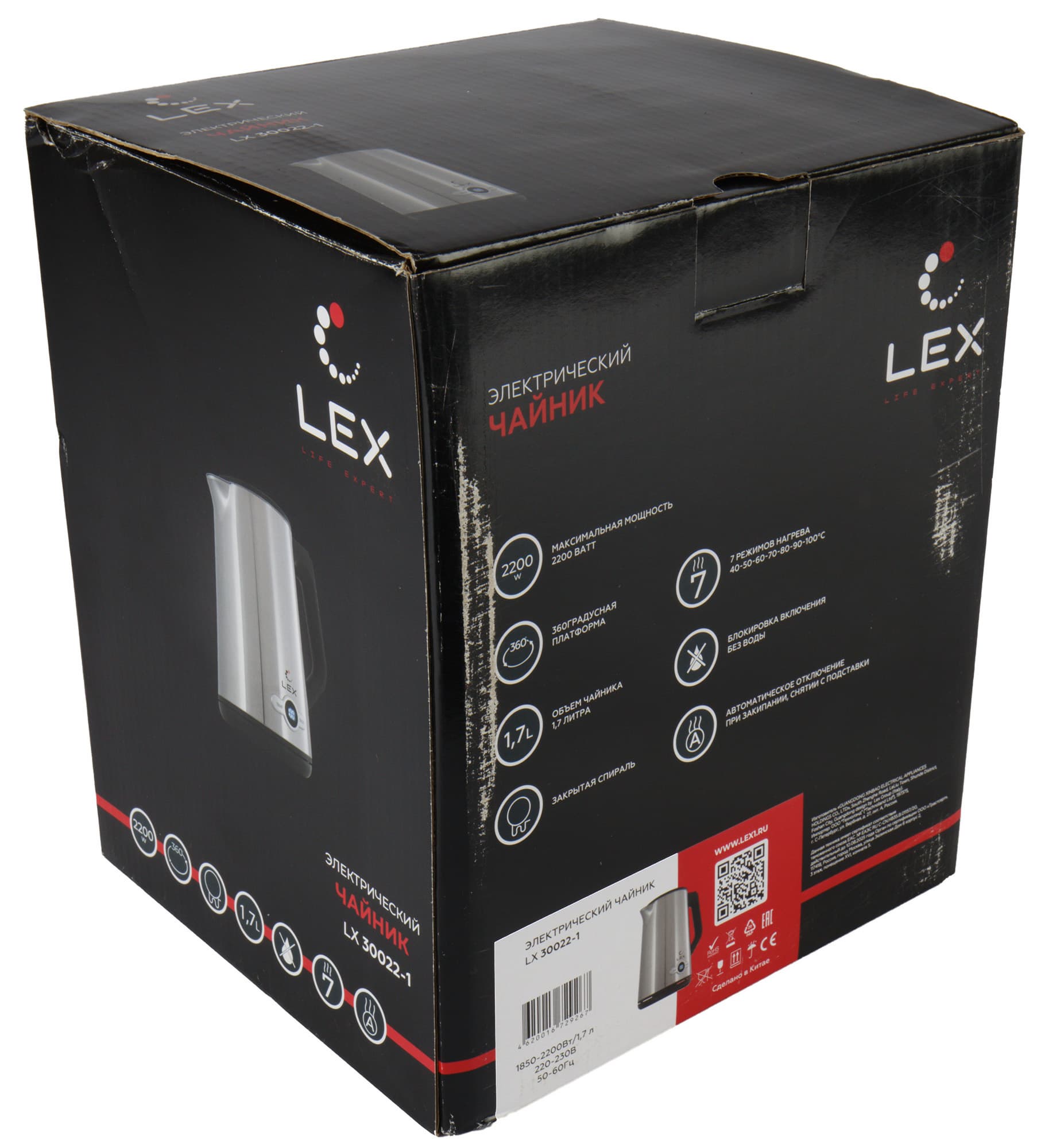 В комплект поставки Lex LX 30022-1 входит сам чайник, база устройства, руководство пользователя, гарантийный талон и рекламный буклет, рассказывающий о разнообразии бытовой техники этого производителя.