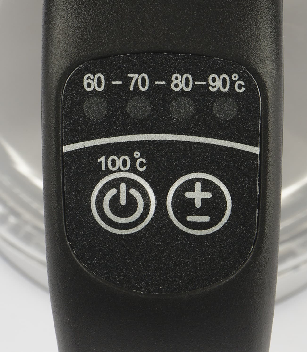 Первая кнопка включает чайник в режиме кипячения, а последовательными нажатиями на вторую можно выбрать нужную температуру подогрева: 60, 70, 80 или 90 °C.