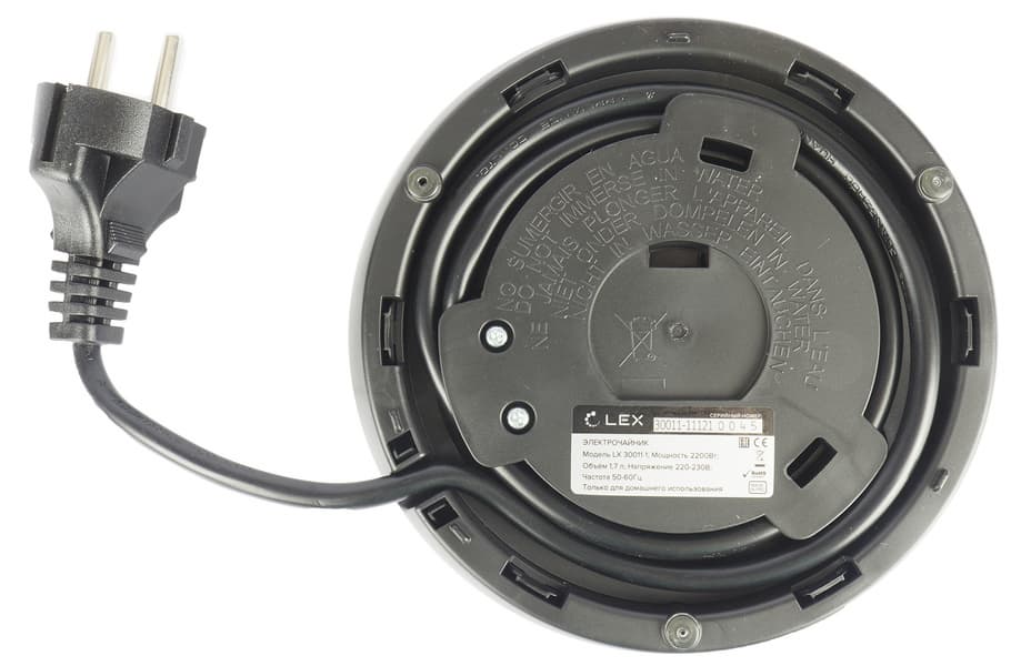 Как и у большинства современных чайников, нагревательный элемент у LX30012-1 скрытого типа, дно гладкое. Над ним возвышается только металлический колпачок термодатчика, а по периметру проходит полоса RGB-светодиодов, отвечающих за подсветку корпуса.