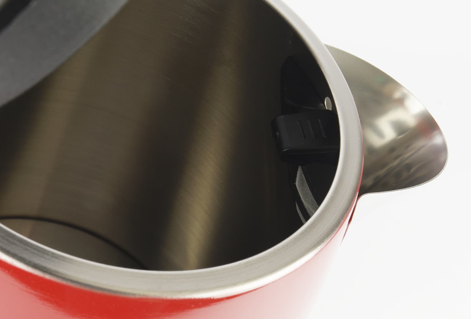 Металлический носик приклеен к верхней части корпуса. Внутри колбы, перед решеткой выливного отверстия, расположен съемный фильтр против накипи: металлическая сетка в пластиковой рамке.
