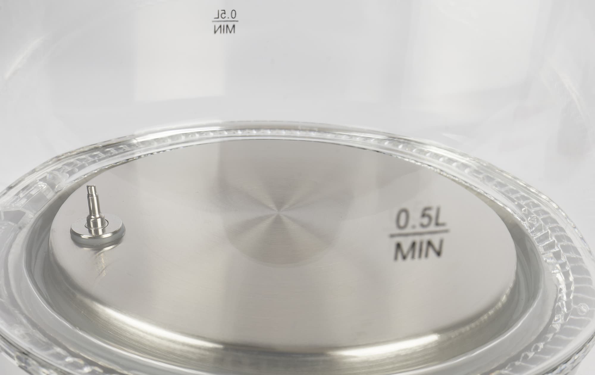 Метки объема нанесены на боковые стороны колбы с двух сторон. Между минимальным (0,5 л) и максимальным уровнями нанесена также отметка 1 л.