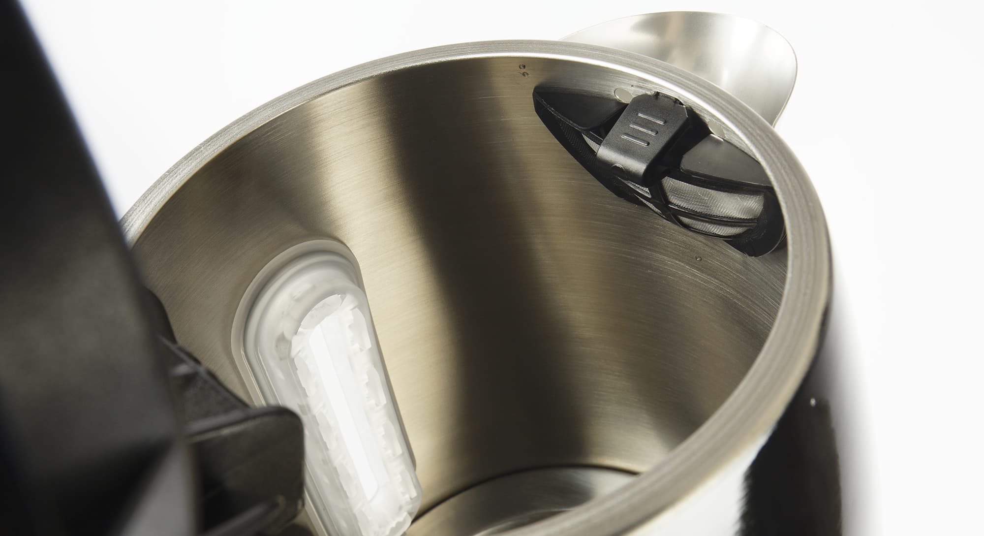 Носик чайника представляет собой единое целое с корпусом. Съемный фильтр от накипи расположен внутри последнего и представляет собой стандартную металлическую сетку на пластиковой рамке.