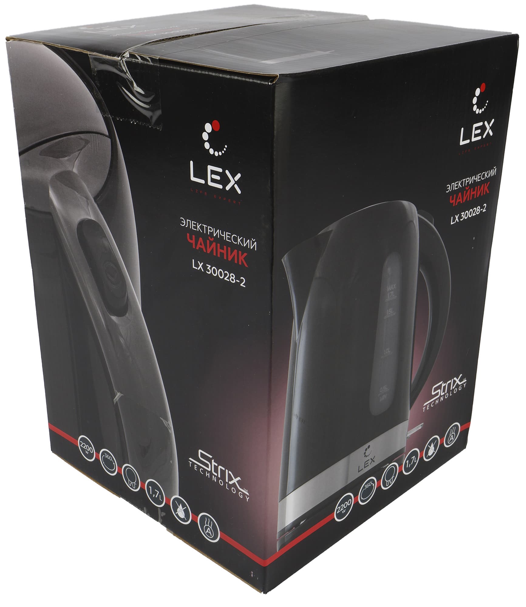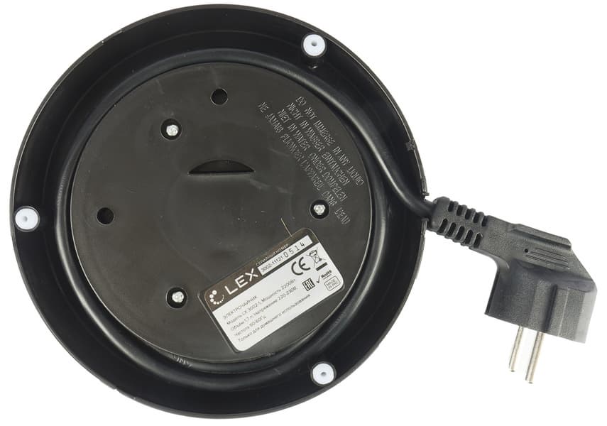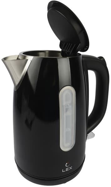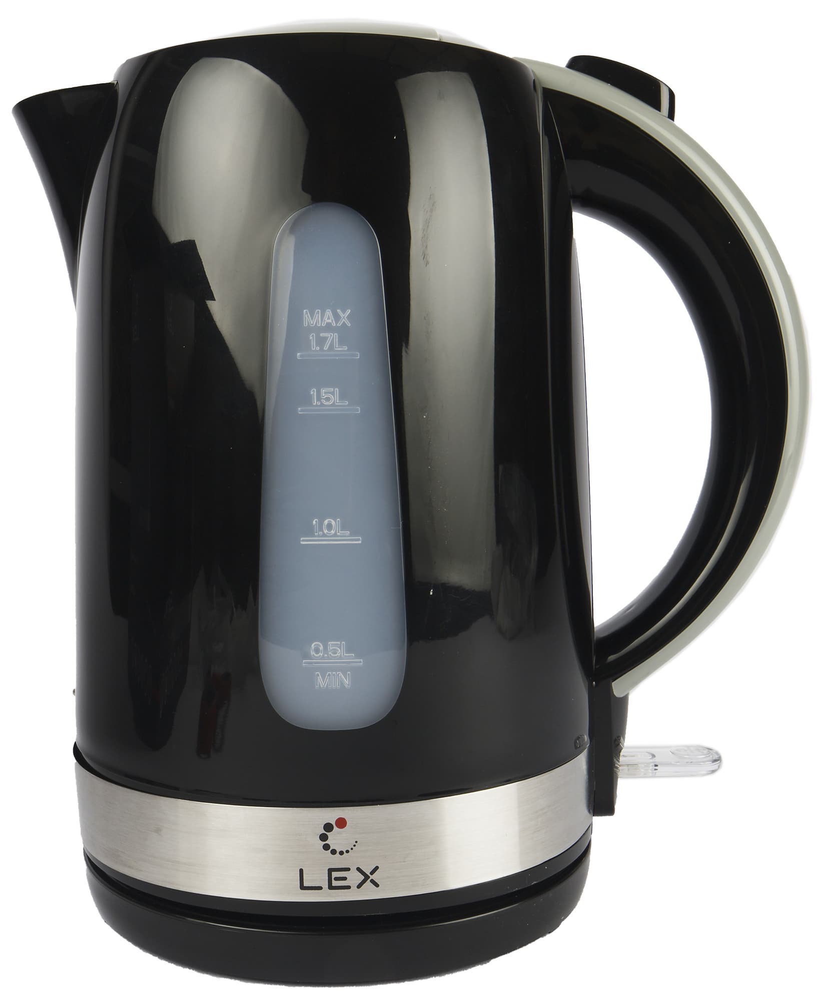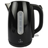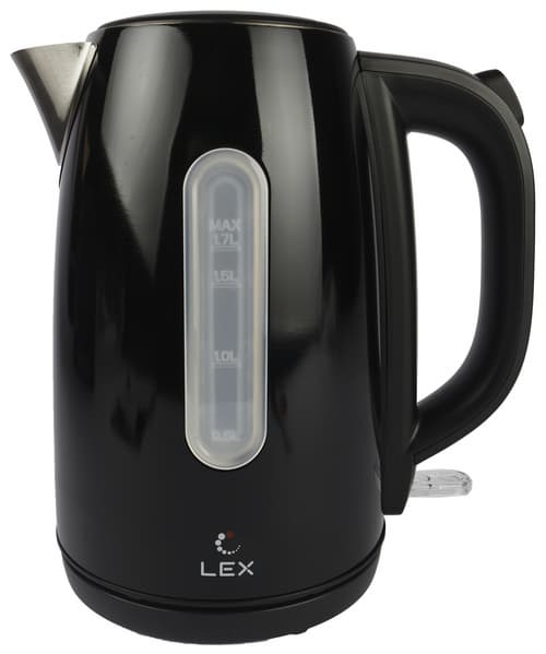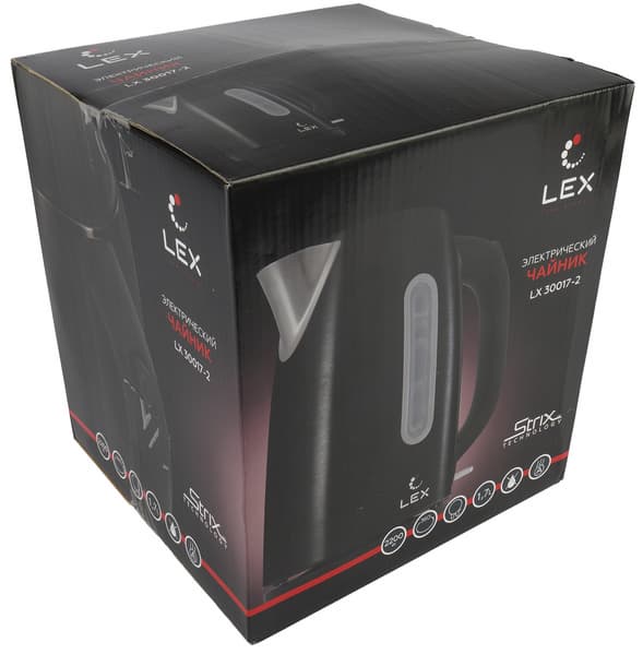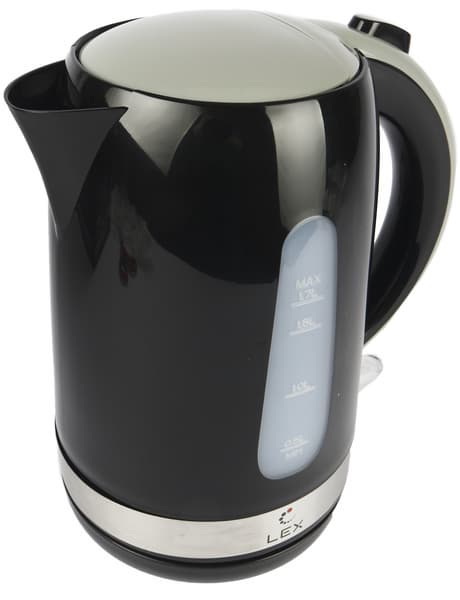 Чайник сделан из черного пластика, а элементы отделки (ручка и крышка) — светло-серые. Также производитель предлагает эту модель в белом и бежевом исполнениях. В нижней части корпус украшен металлическим пояском с логотипом Lex.