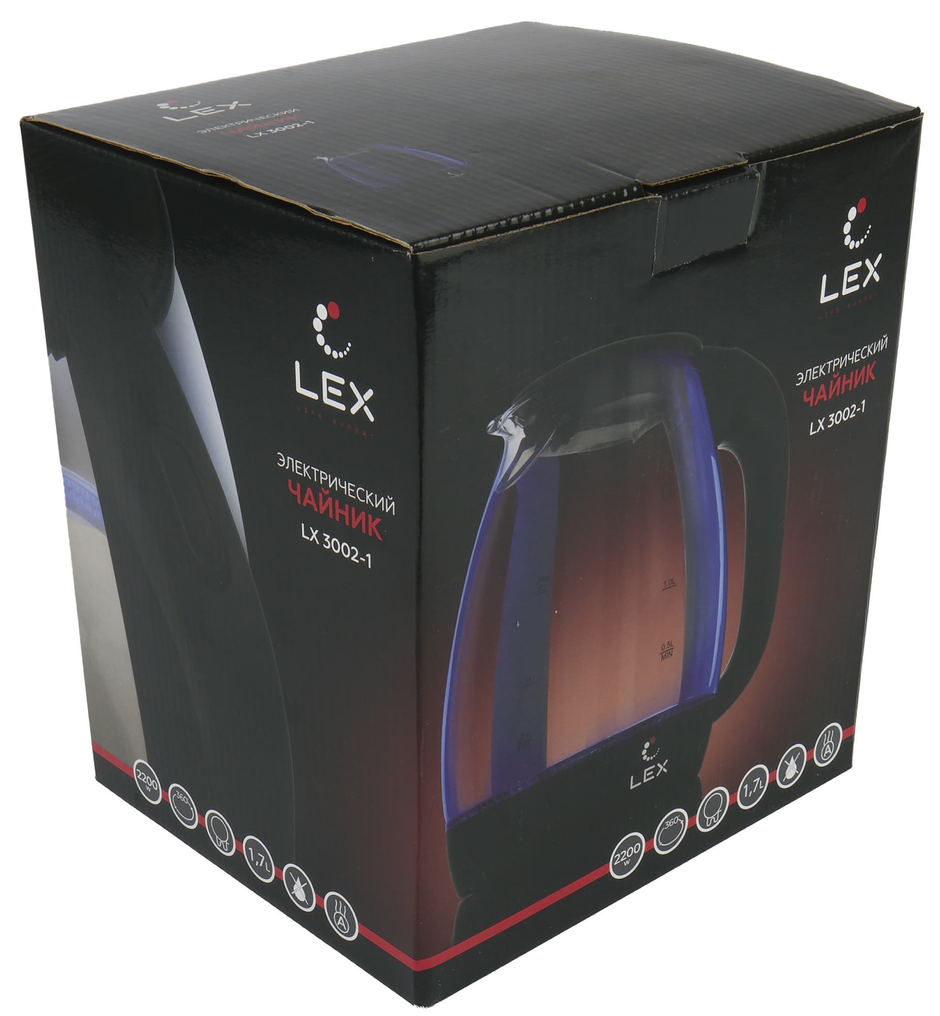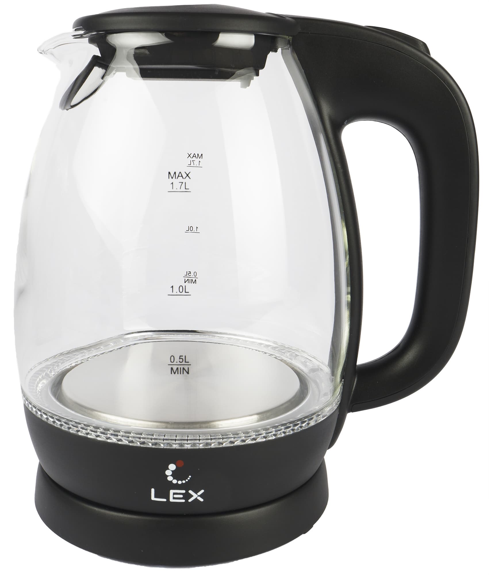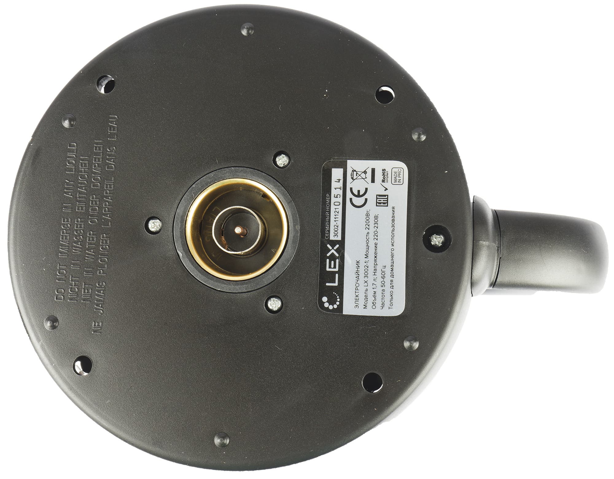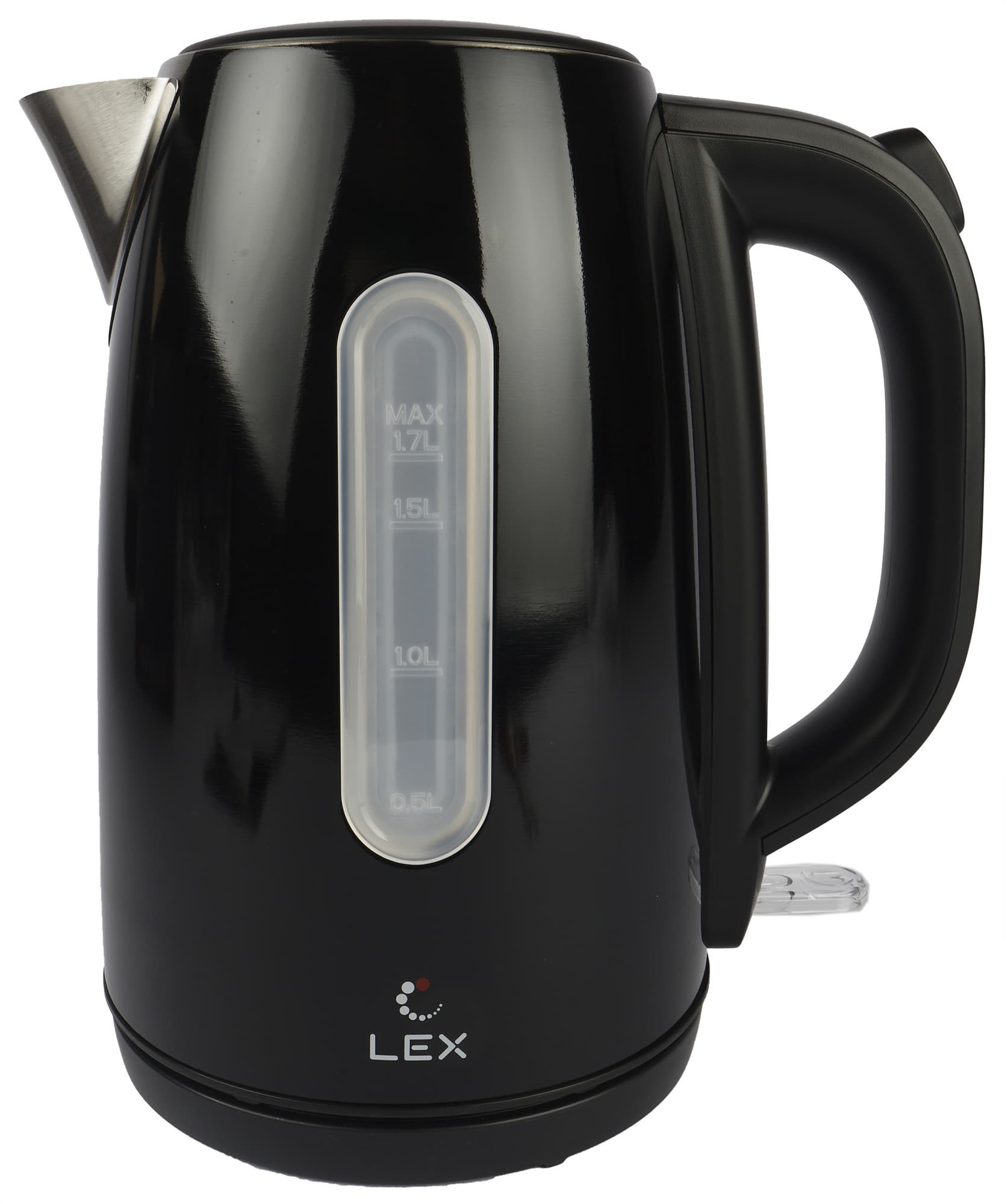 Чайник сделан из черного пластика, а элементы отделки (ручка и крышка) — светло-серые. Также производитель предлагает эту модель в белом и бежевом исполнениях. В нижней части корпус украшен металлическим пояском с логотипом Lex.