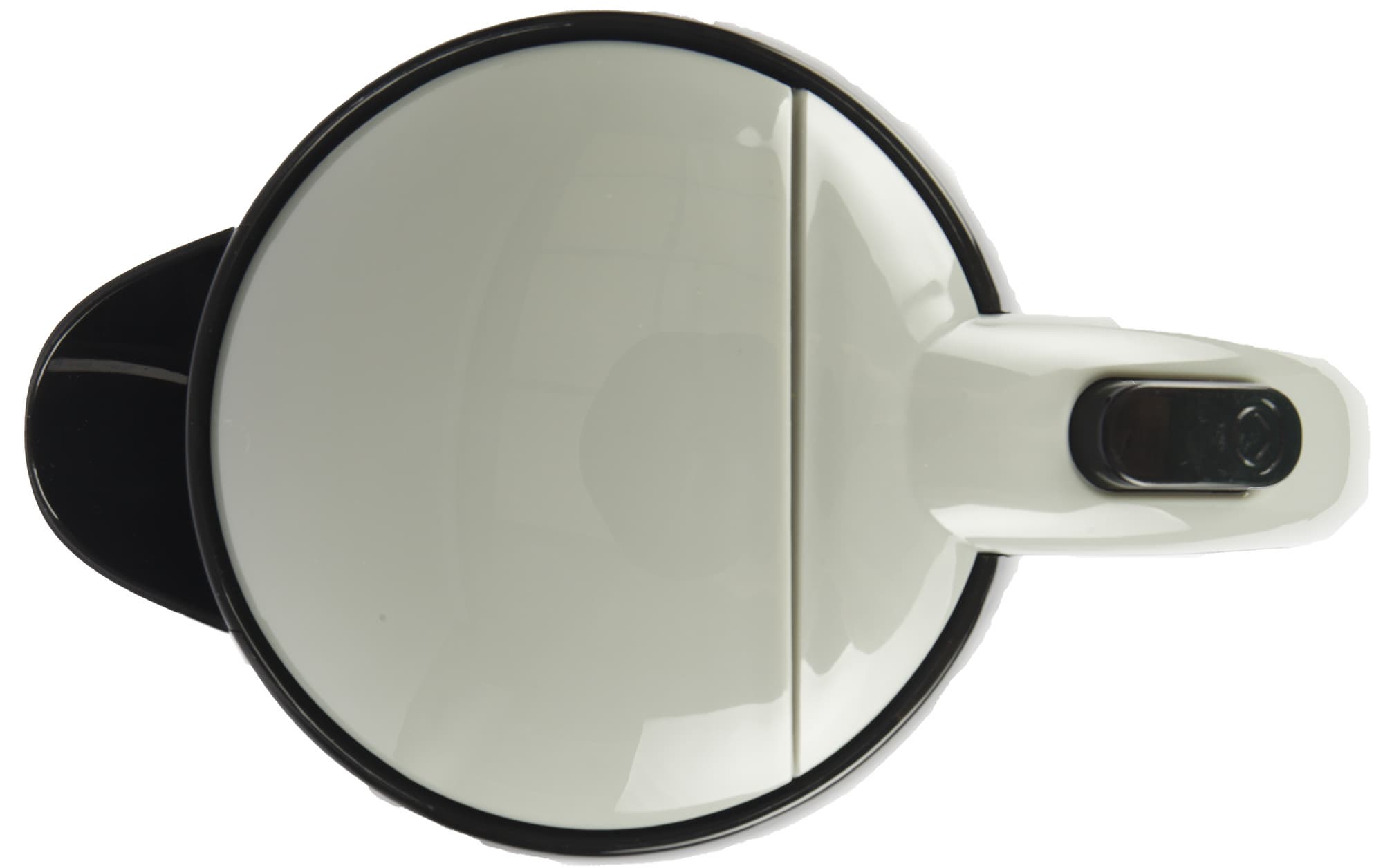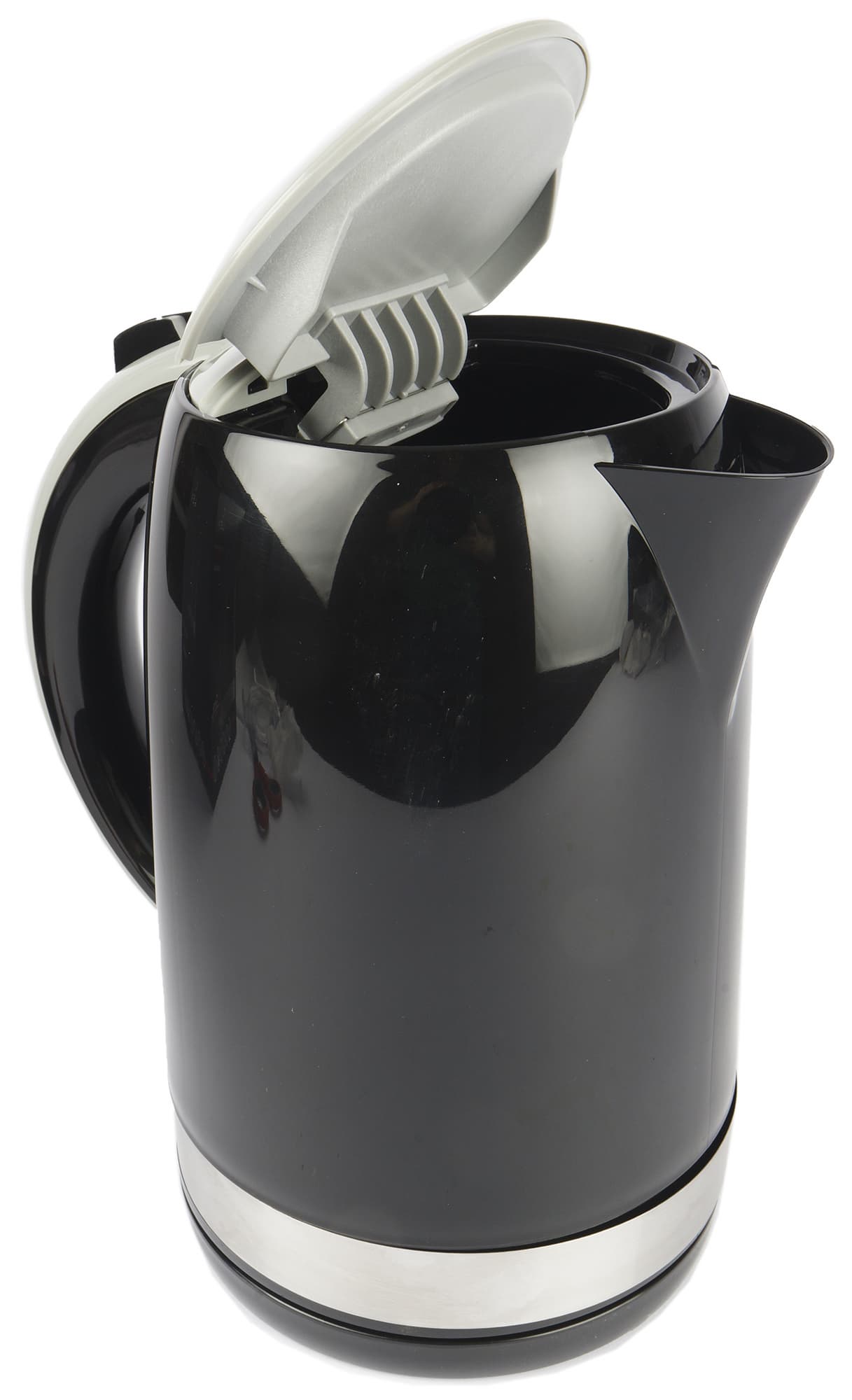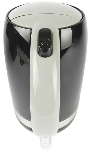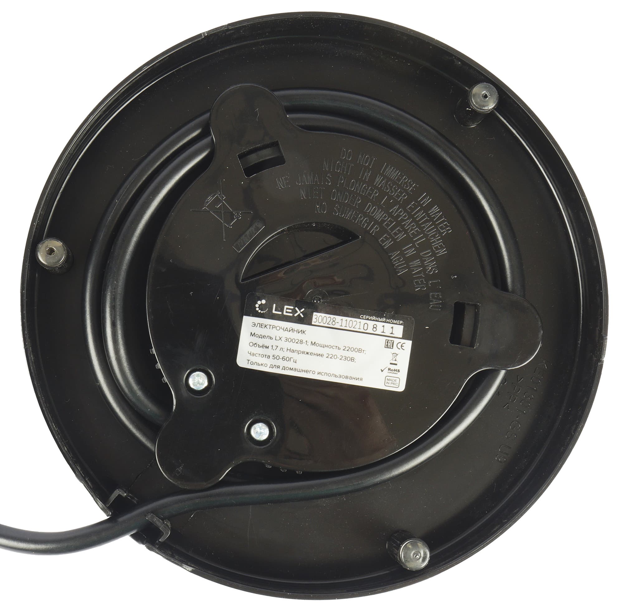 Чайник сделан из черного пластика, а элементы отделки (ручка и крышка) — светло-серые. Также производитель предлагает эту модель в белом и бежевом исполнениях. В нижней части корпус украшен металлическим пояском с логотипом Lex.