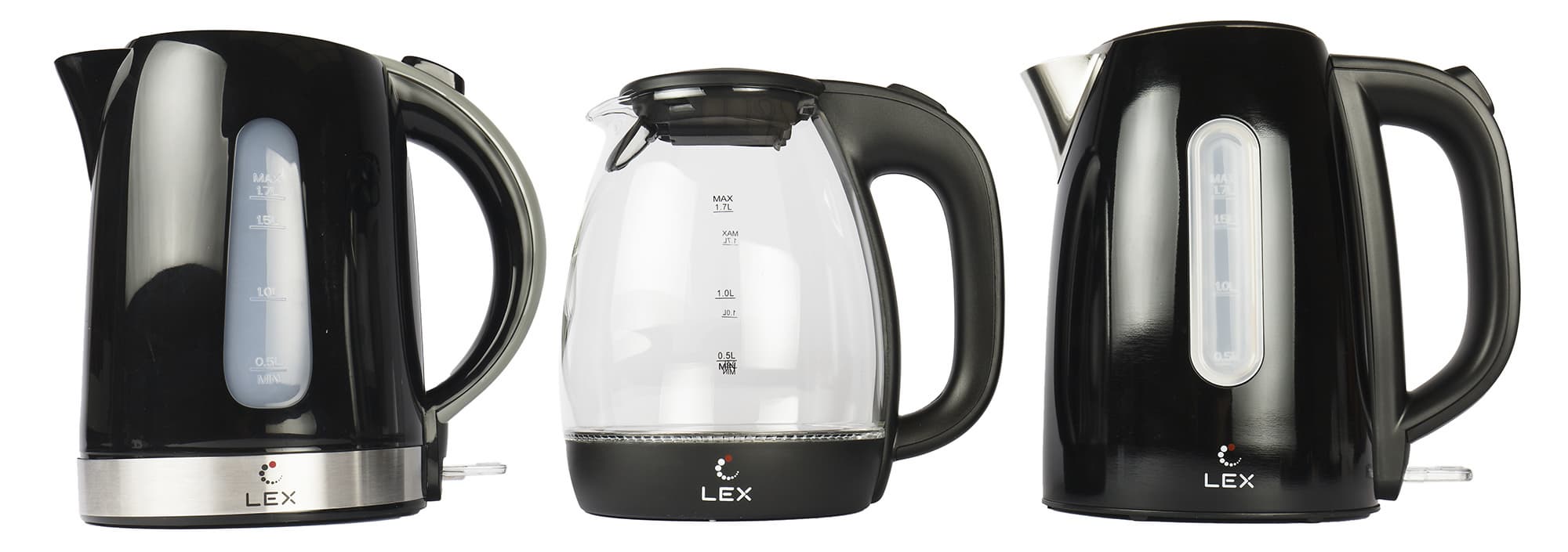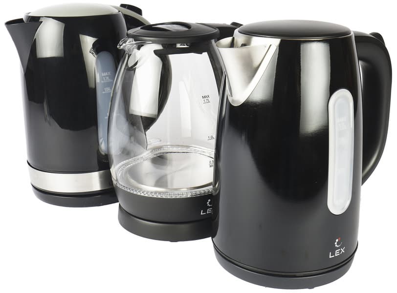 Три рассмотренных нами модели собраны на сходной элементной базе, у них простая конструкция и одинаковые технические характеристики. Разница только в материале корпуса: у Lex LX30028-2 он пластиковый, колба Lex LX3002-1 сделана из жаростойкого стекла, а емкость Lex LX30017-2 — из нержавеющей стали. Несущественные различия, проявившиеся в ходе лабораторных измерений, обусловлены разницей в выборе материалов и конструкции моделей.