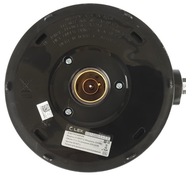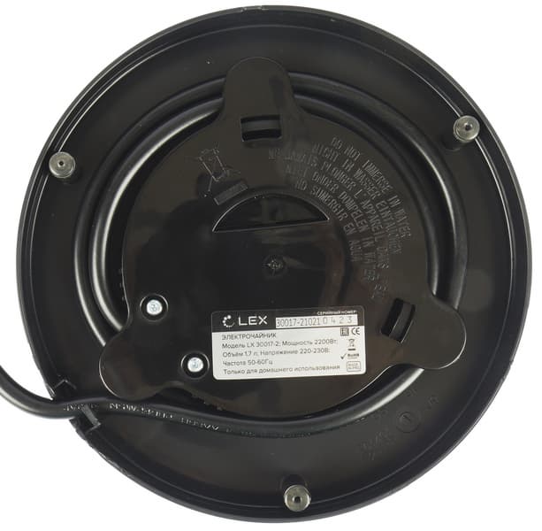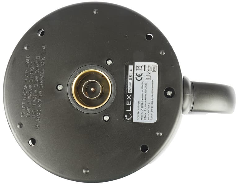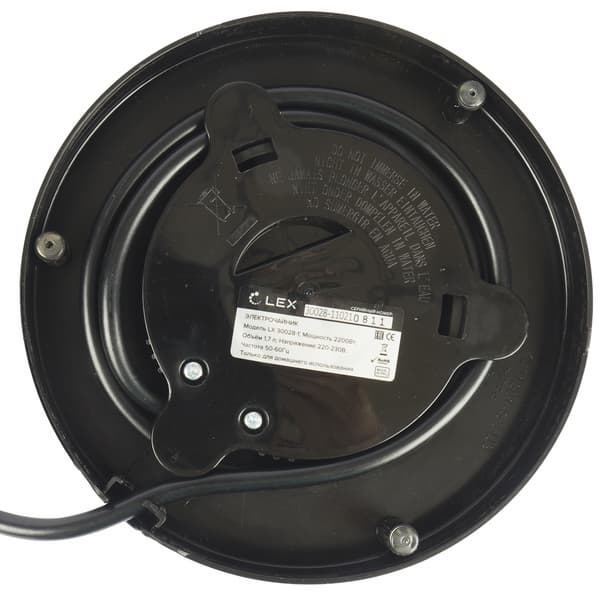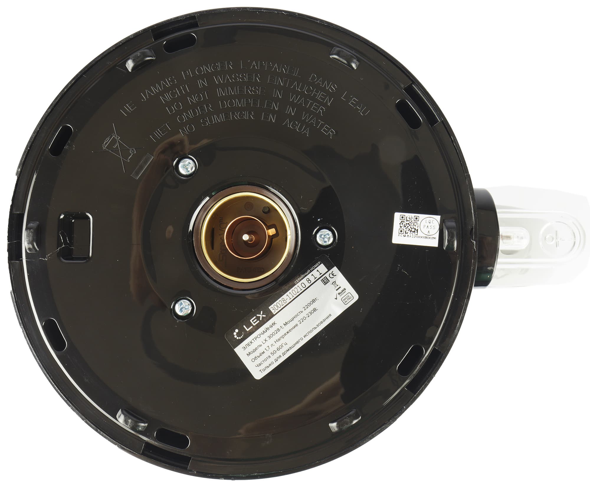 На дне чайника размещена трехконтактная группа. Рядом с ней — наклейка с серийным номером, индексом модели и краткими техническими характеристиками.