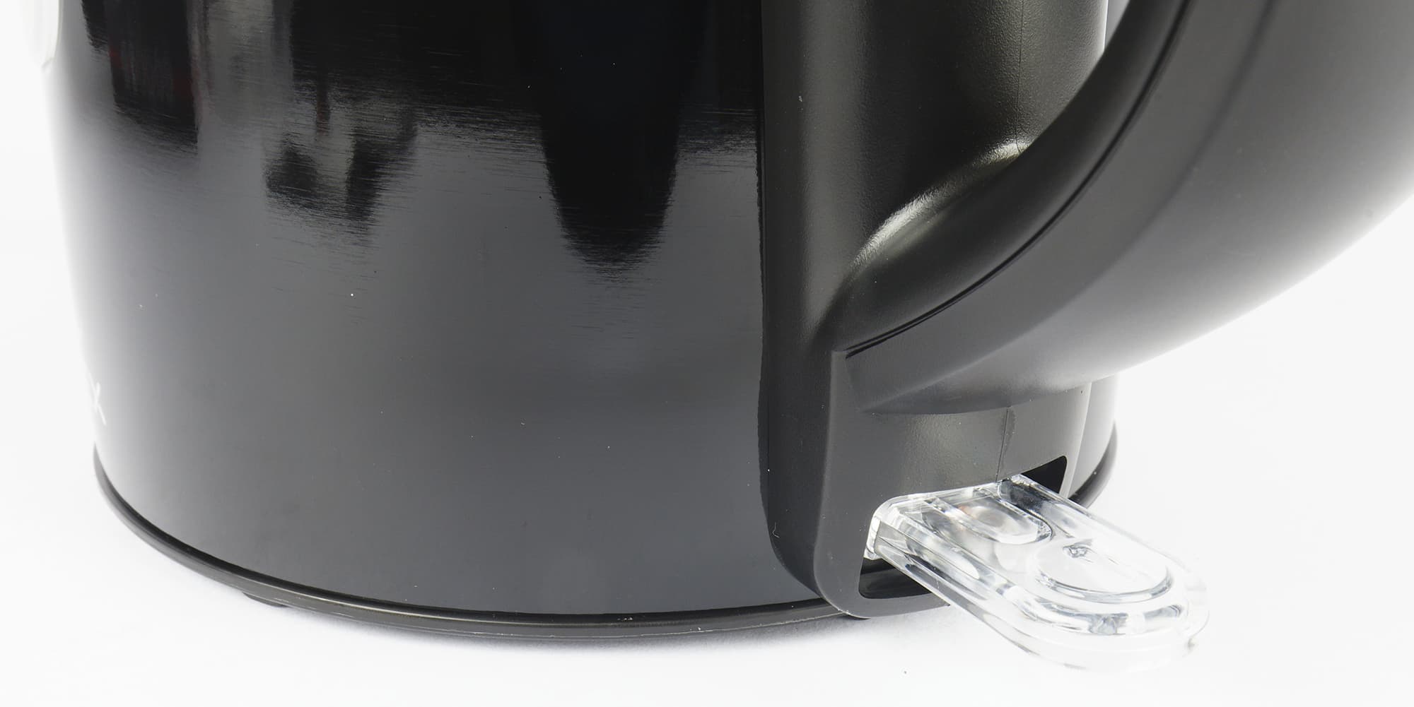 В левый бок корпуса вклеен указатель уровня из матового пластика, работающий по принципу сообщающихся сосудов. Как и у двух других чайников, тут есть отметки 0,5 л (минимальный уровень воды), 1 л и 1,7 л (максимальная емкость).