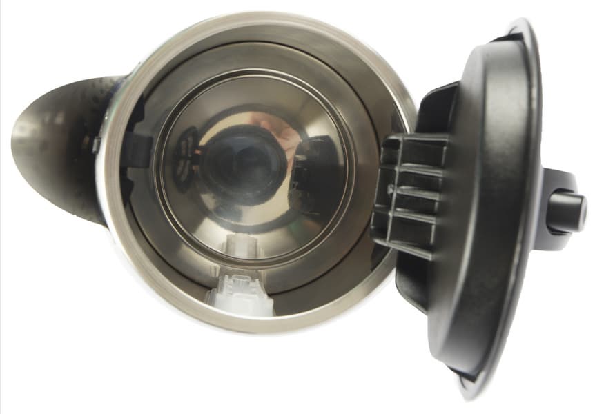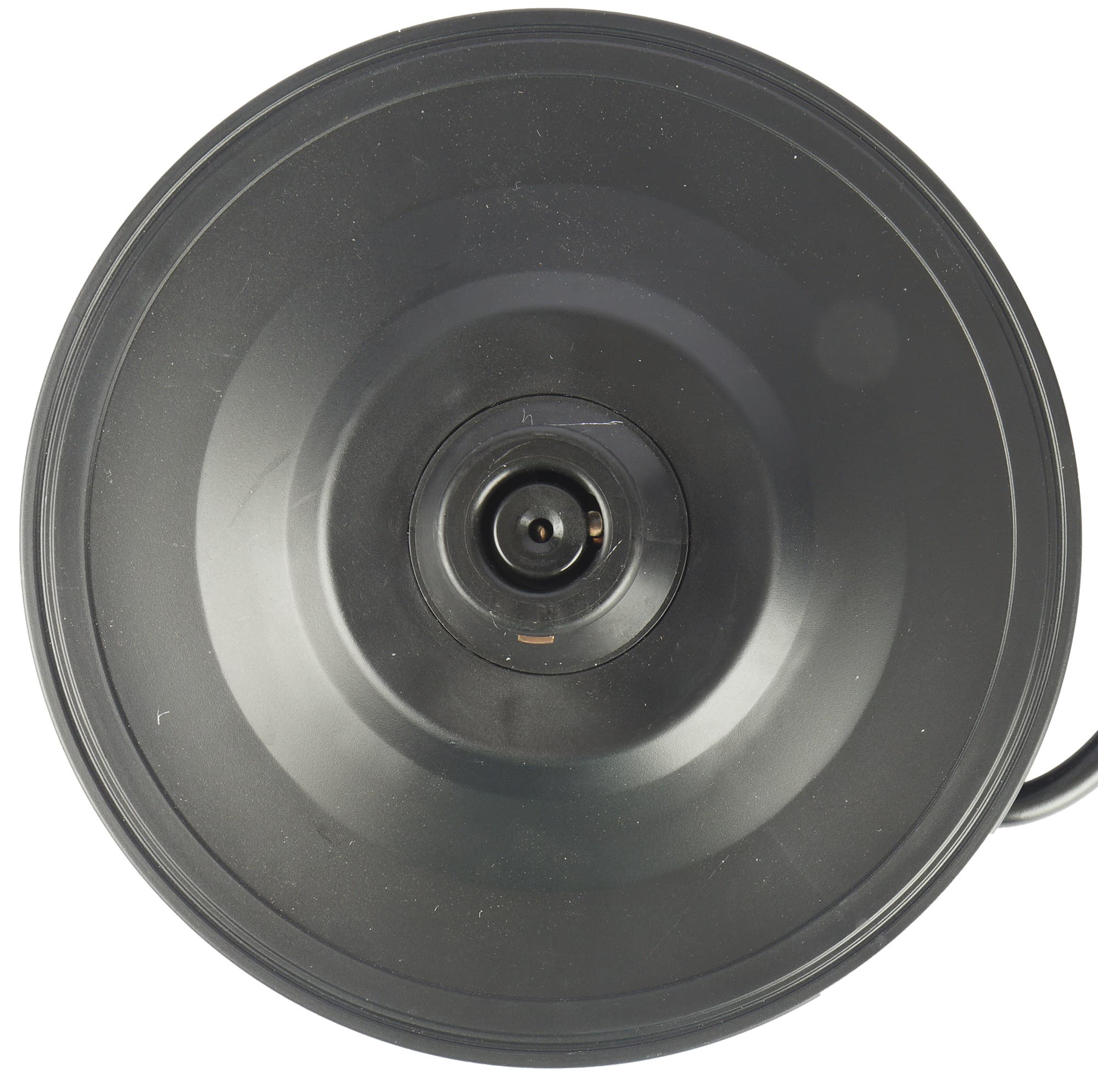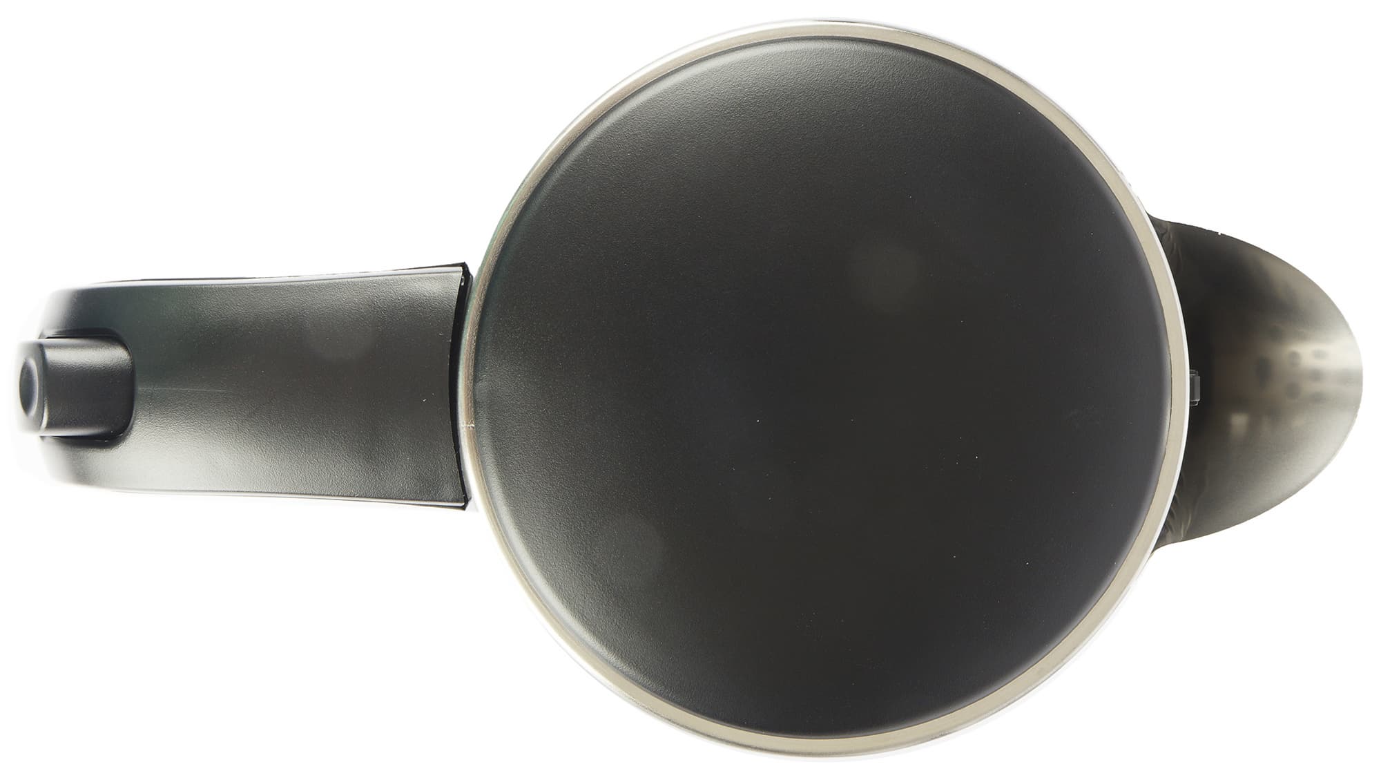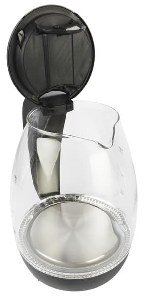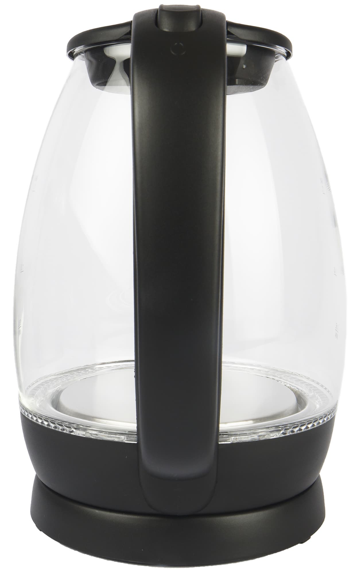 Дно колбы гладкое, нагревательный элемент скрытого типа, никаких выступающих элементов нет. По периметру расположено светодиодное кольцо, подсвечивающее воду во включенном чайнике синим светом.