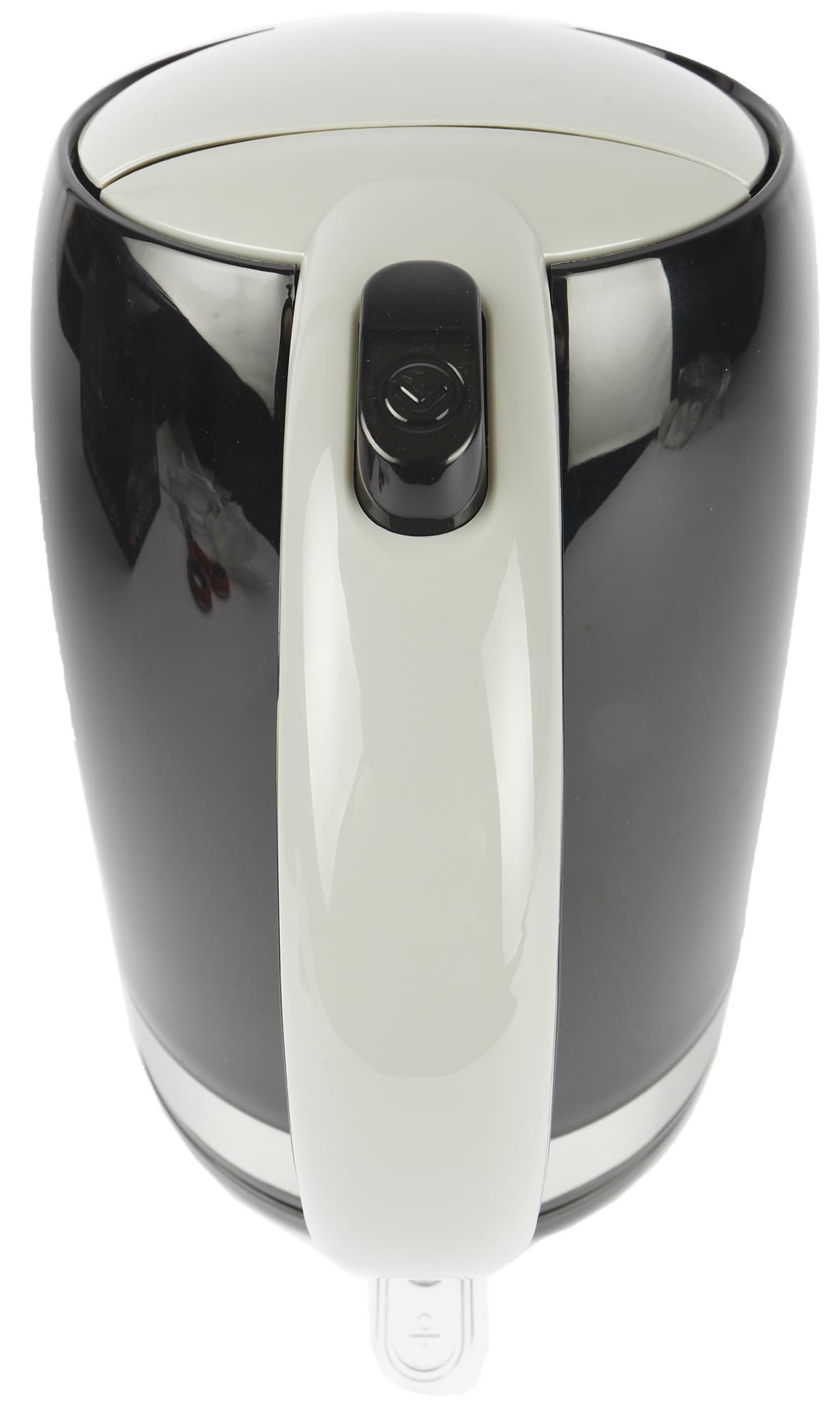 Чайник поставляется в черной картонной коробке с полноцветной печатью. На ее сторонах мы видим фотографии устройства с логотипом производителя, а в нижней части — строку иконок, иллюстрирующих основные особенности модели. Среди них высокая мощность (2200 Вт), объем (1,7 л), наличие защиты от перегрева и включения без воды, конструкция подставки, обеспечивающей вращение на 360°, и автоматическое отключение.