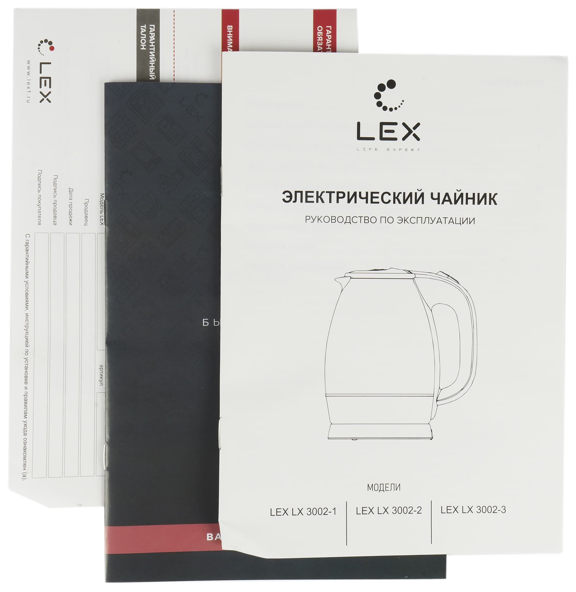 Из коробки мы достали сам чайник, подставку с электрошнуром, руководство пользователя, гарантийный талон и буклет с информацией о новинках бытовой техники Lex.