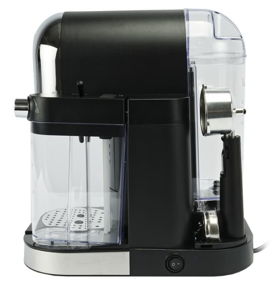 Компоновка элементов у прибора классическая: по центру расположена заварочная группа и рожок, снизу под ним — поддон для сбора капель, справа — кувшин-капучинатор. Рожок устанавливается ручкой влево и закрепляется поворотом против часовой стрелки. Максимальная высота чашки, которая поместится под рожком, составляет 14 см.