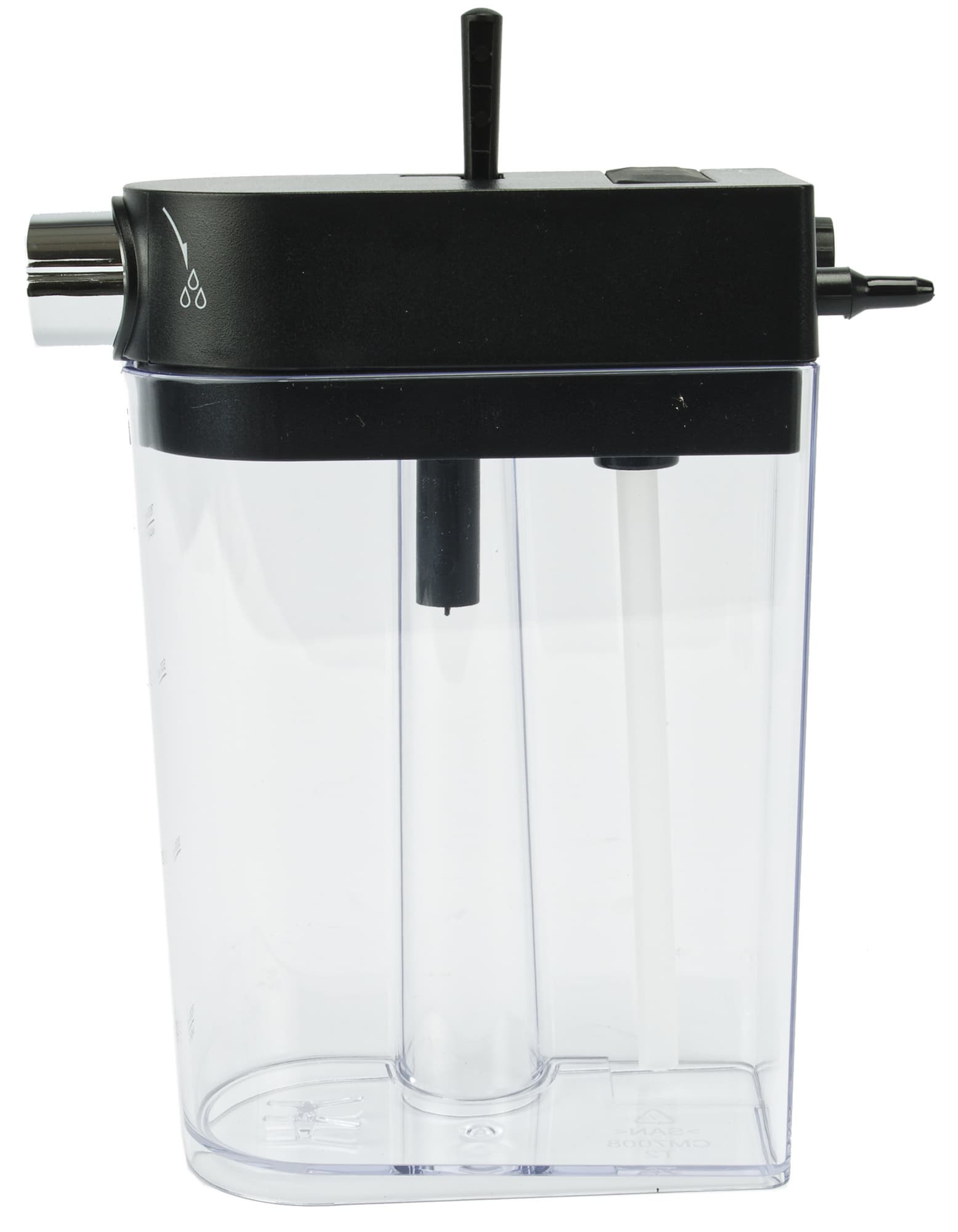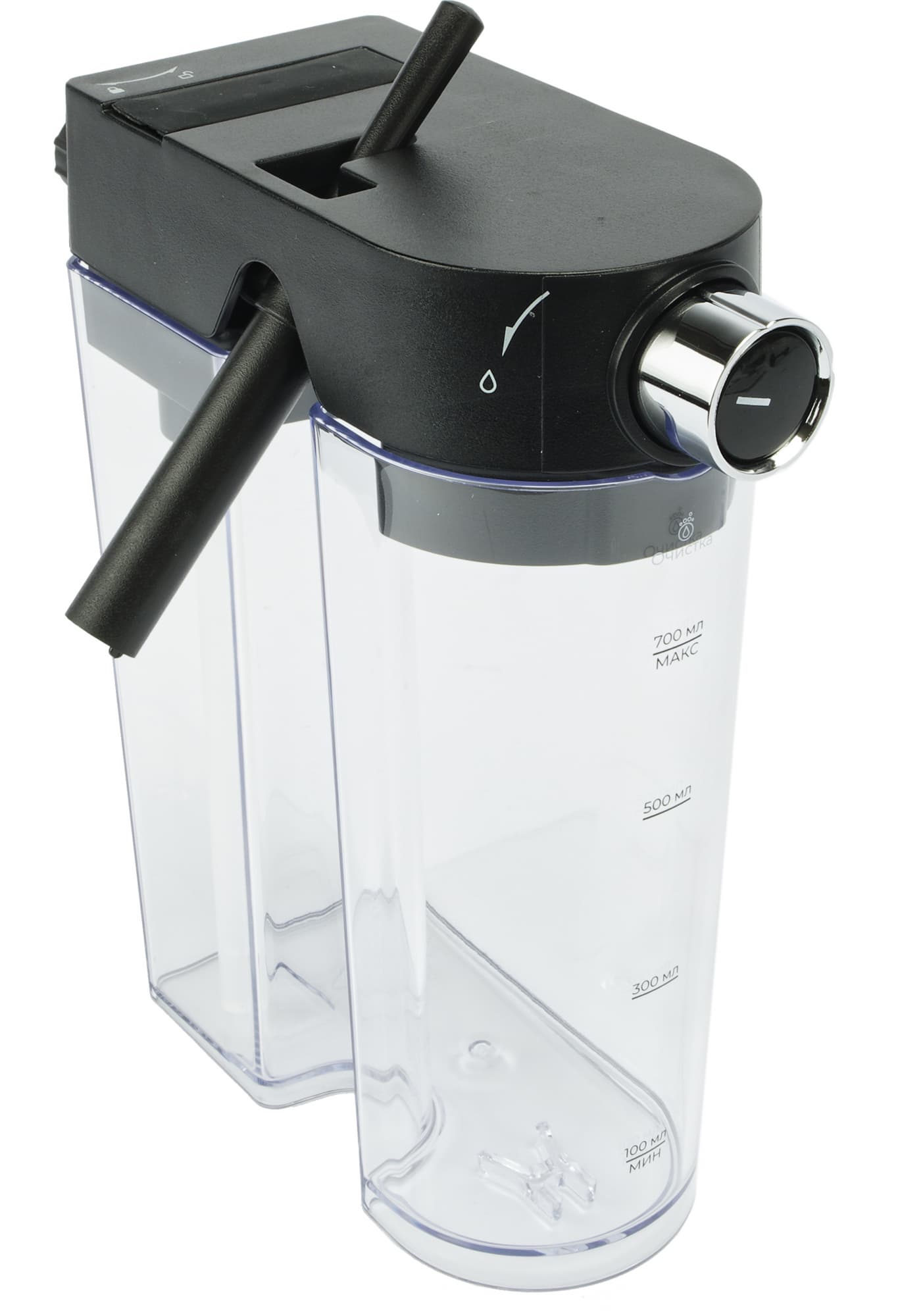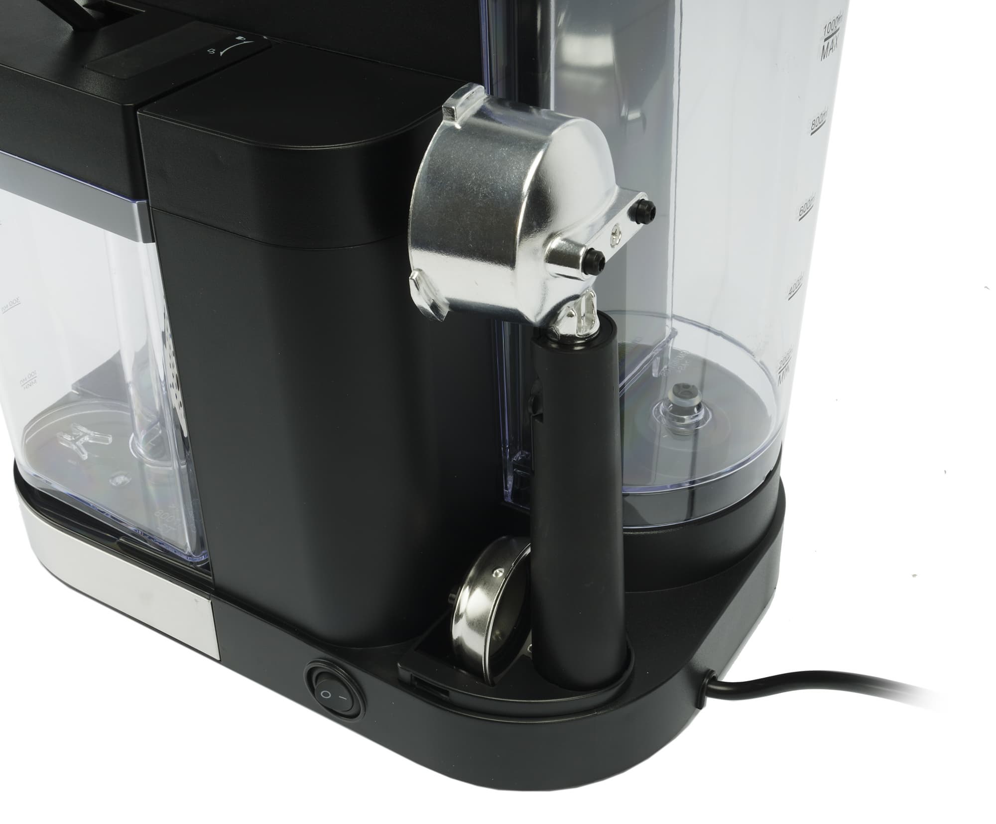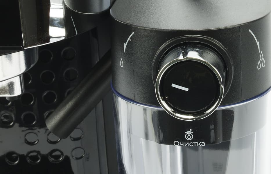 Трубка капучинатора пластиковая. Пожалуй, это ключевой элемент, по которому мы можем определить, что перед нами именно бюджетное решение. Сверху у кувшина находится ручка регулировки наклона трубки подачи молочной пены. А на лицевой стороне — переключатель подачи молока/молочной пены.