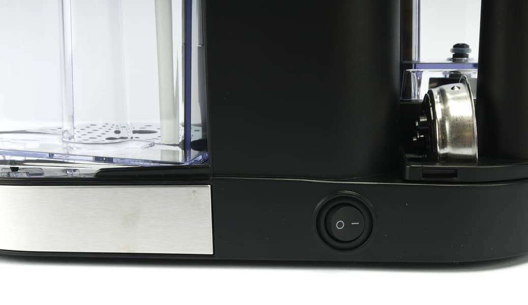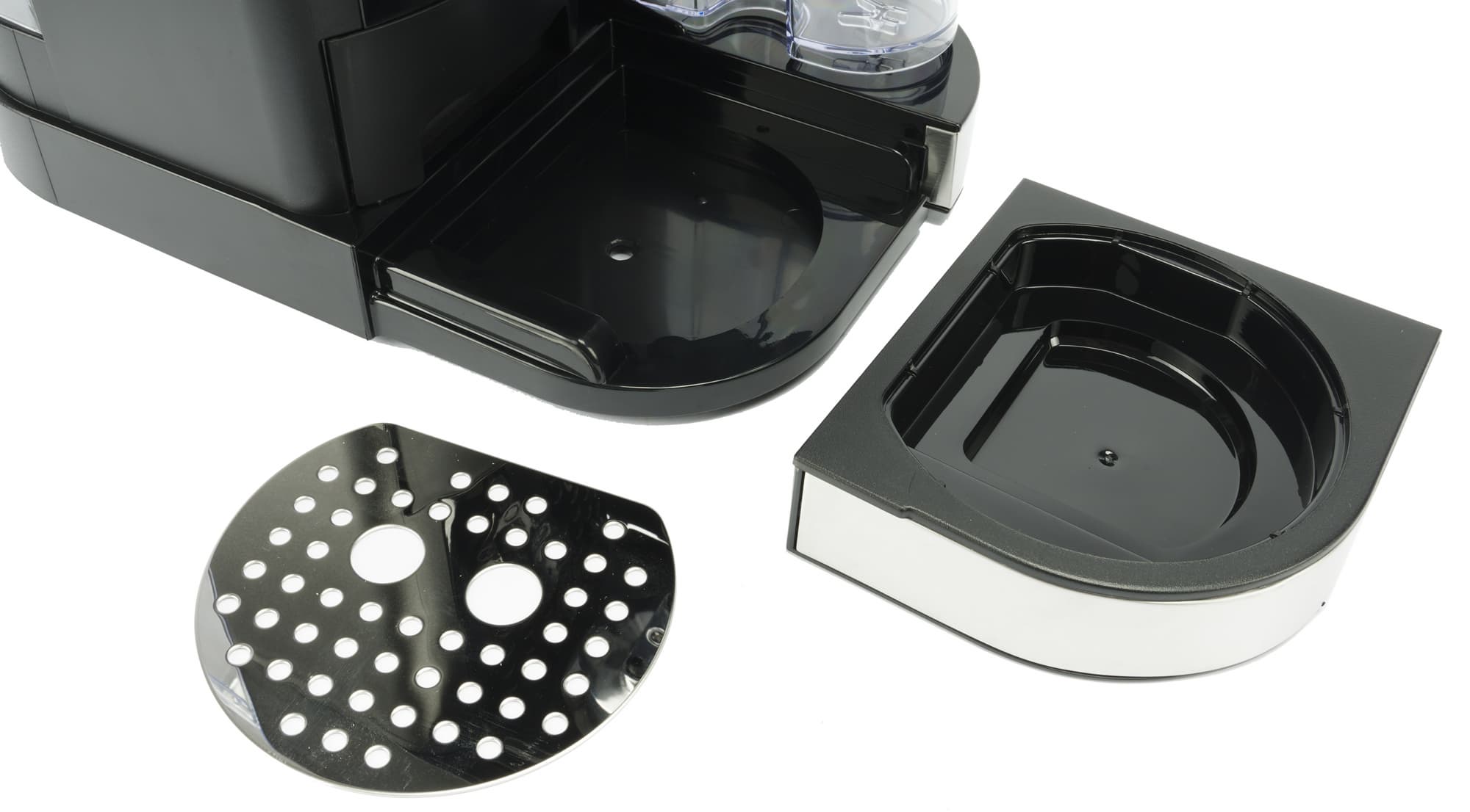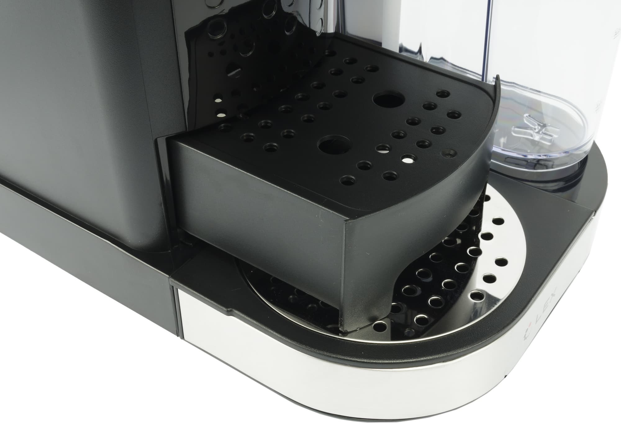 Съемный пластиковый контейнер для сбора капель закрыт металлической крышкой. Индикатора переполнения не предусмотрено. Выдвижная подставка для маленьких чашек также выполняет функцию контейнера для сбора капель. Правда, подставка для чашек на этот раз будет пластиковая, а не металлическая.