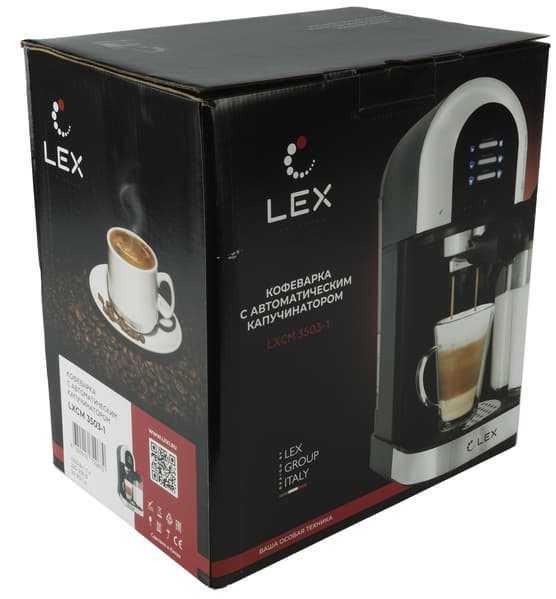 Кофеварка поставляется в коробке, оформленной в фирменных цветах Lex: черный фон, ярко-красные элементы оформления, полноцветные фотографии кофеварки.