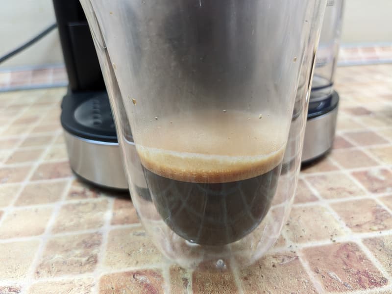 Выглядит средне, правда? Дело в том, что рожок с «улучшайзером» буквально взбивает пену во время пролива кофе. В результате вместо пенки крема мы видим множество крупных пузырей. Одинарный эспрессо оказался не слишком выразительным, но вполне пригодным к употреблению.