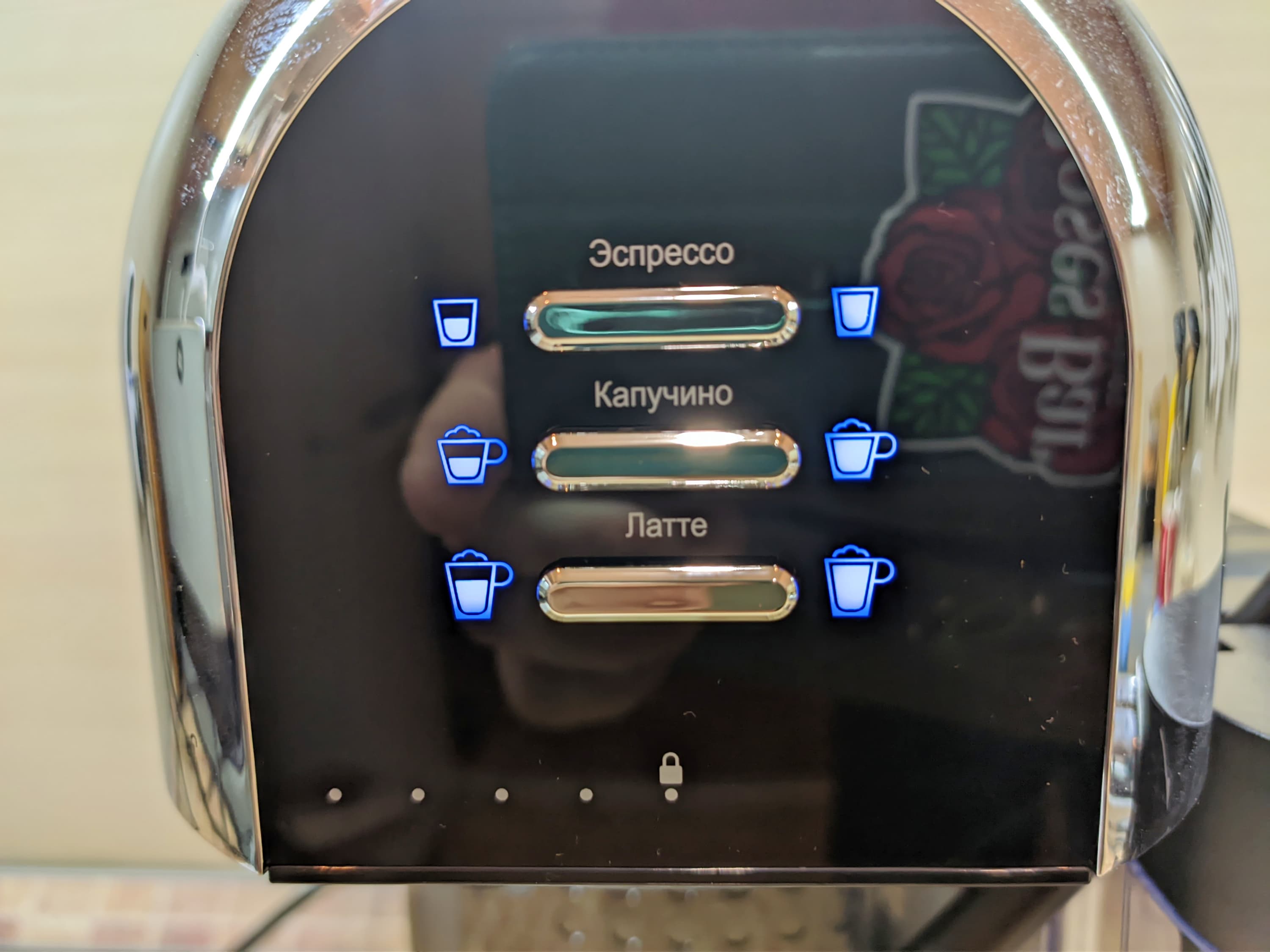 Первая кнопка отвечает за приготовление одинарной и двойной порции эспрессо (одно и два нажатия соответственно). Вторая — за приготовление одинарной и двойной порции капучино. Третья — за приготовление одной или двойной порции латте.