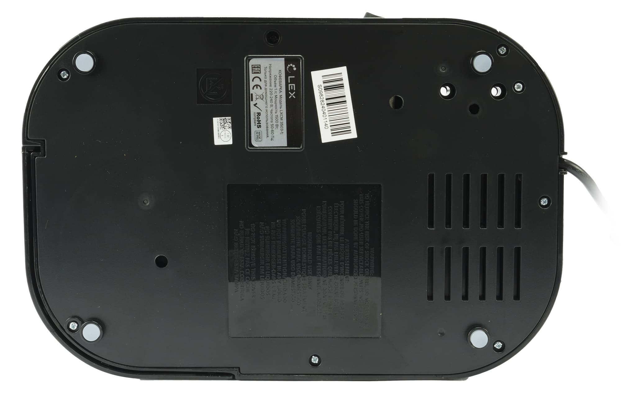 Снизу у нашей кофеварки нет ничего примечательного. Тут мы видим вентиляционные отверстия, пару наклеек с технической информацией и штрих-кодом, а также резиновые ножки, препятствующие скольжению устройства по рабочей поверхности.
