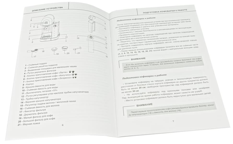 Содержание инструкции нам понравилось: тут мы нашли исчерпывающие пояснения, касающиеся всех аспектов работы с кофеваркой. Многие действия сопровождаются дополнительными комментариями, пояснениями и иллюстрациями. Единственное, что может доставить сложность — постоянный поиск нужного элемента: посмотрите на капучинатор (14), расположенный на рисунке (11), а потом — на емкость (16) с рисунка (1). Вполне логично, что рисунки 1 и 11 расположены на страницах 8 и 19 соответственно.