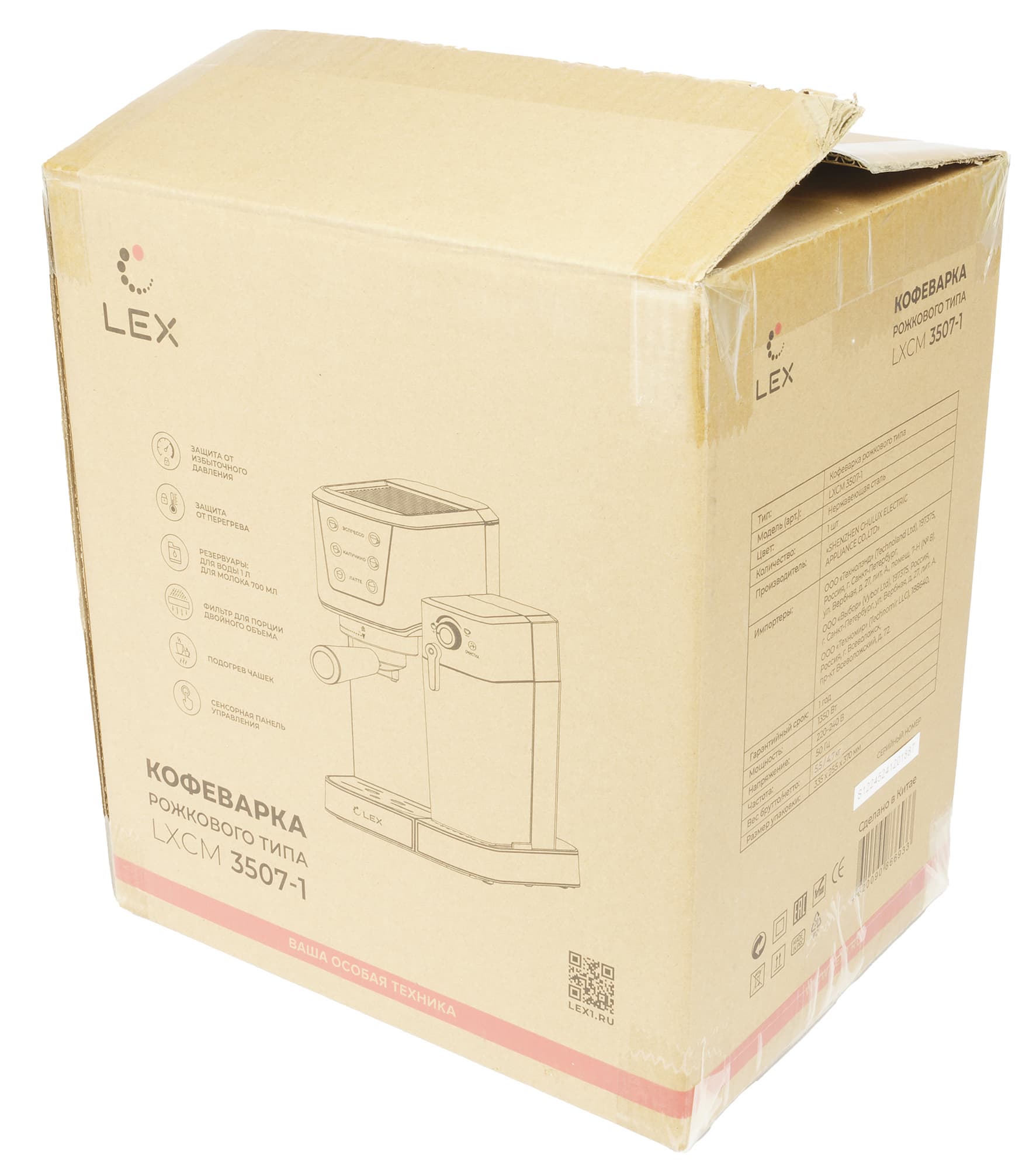 Кофеварка Lex LXCM 3507-1 поставляется в коробке из промышленного картона с изображением устройства и указанием основных технических характеристик прибора.