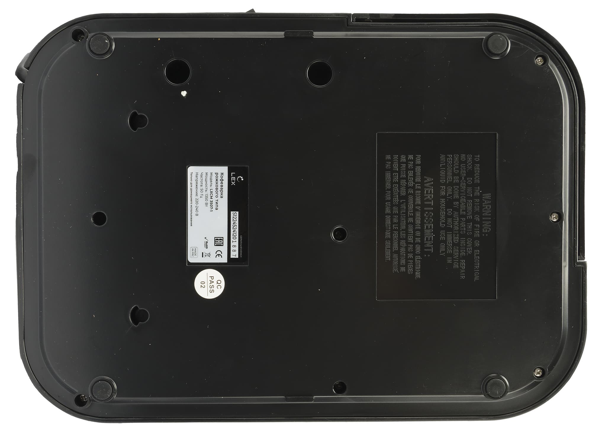 Кофеварка опирается на четыре резиновые ножки, обеспечивающие плотное прилегание к поверхности. На нижней части корпуса размещена наклейка с названием производителя, моделью, серийным номером и основными техническими данными.