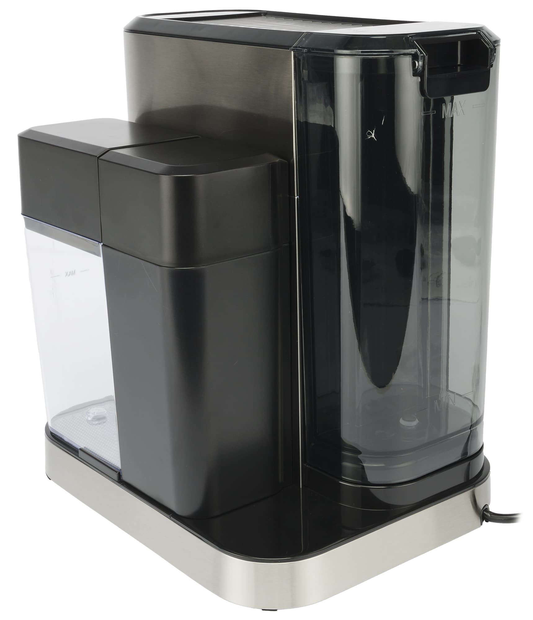 В резервуаре для молока расположены две трубки: металлическая — сопло парового шланга для выхода вспененного молока, и пластиковая — для забора молока. На крышке находится регулятор металлического сопла, который при повороте направляет молочную пену в чашку (а не на стол). Рядом видны настройки регулятора пены: для капучино, латте и режим очистки. Сам резервуар изготовлен из пластика и имеет отметку максимального уровня молока. В инструкции указано, что резервуары для воды и молока следует наполнять так, чтобы уровень жидкости находился между отметками Min и Max, однако на контейнере для молока отметку Min обнаружить не удалось.