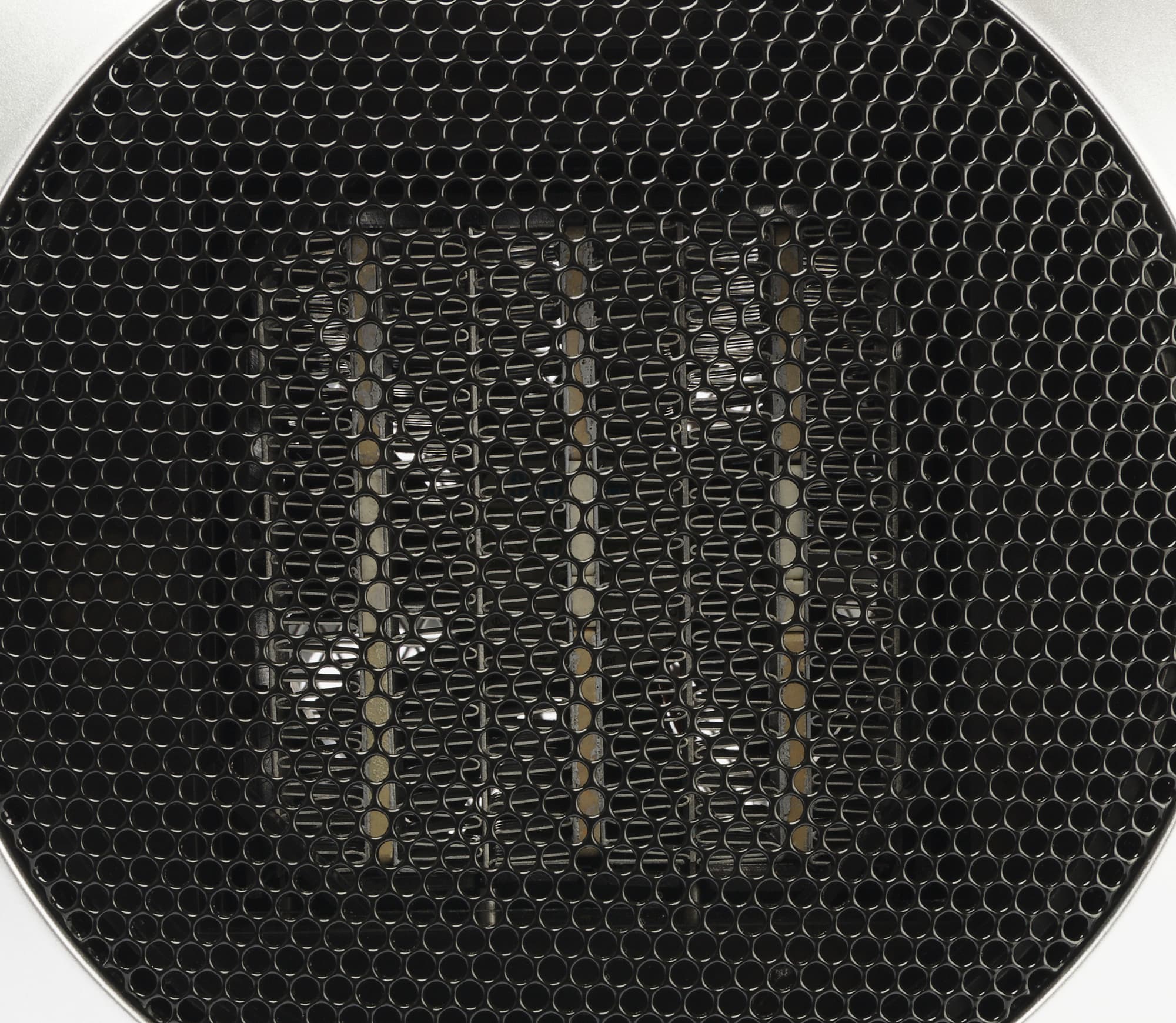 Сквозь решетку мы можем увидеть небольшой прямоугольный (почти квадратный) нагревательный элемент из керамических пластин, за которым прячется вентилятор, обеспечивающий циркуляцию воздуха.