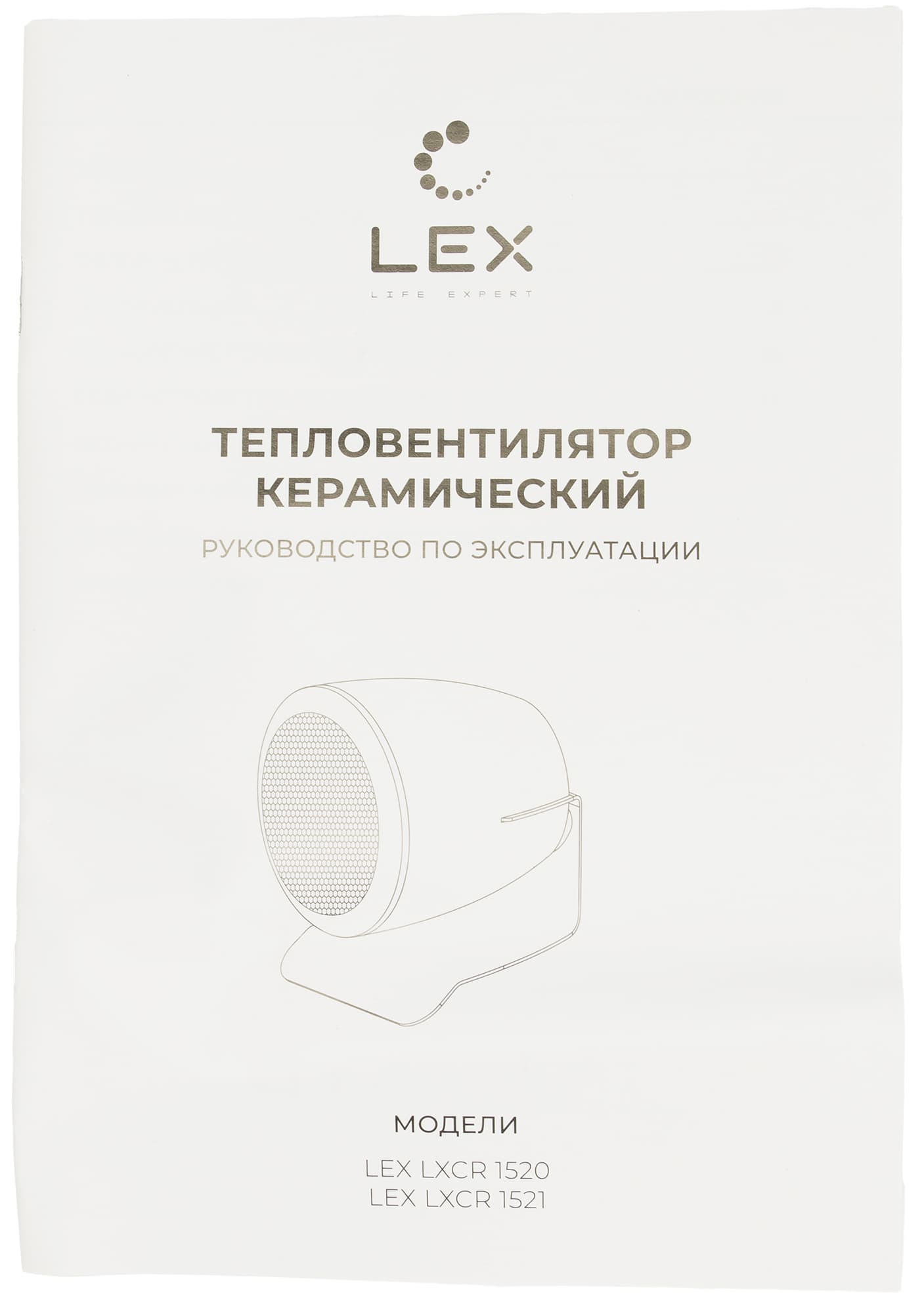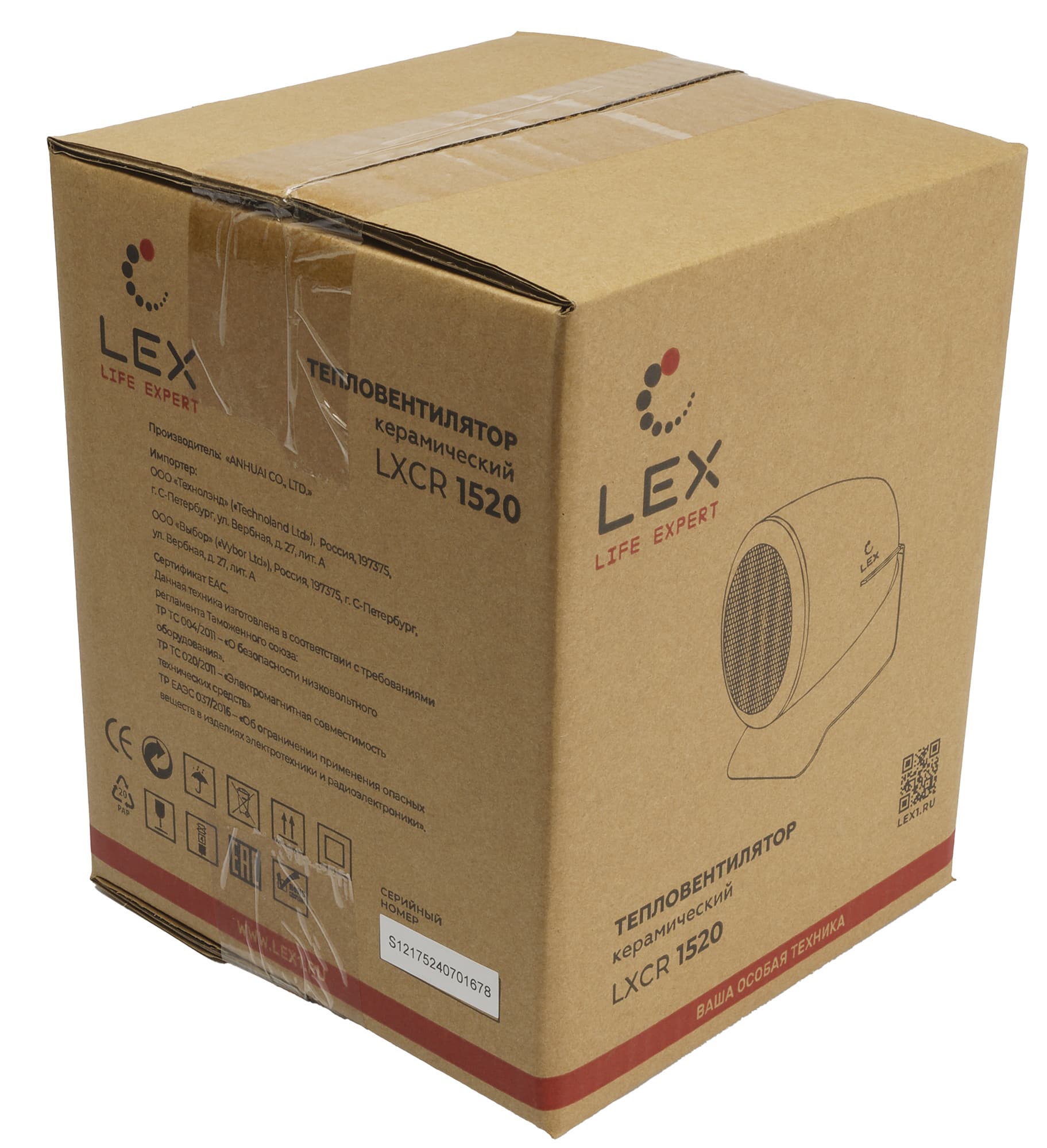 Тепловентилятор Lex LXCR 1520 упакован небольшую прямоугольную коробку из матового коричневого картона, оформленную в фирменном стиле производителя. Лицевую сторону занимает векторное изображение прибора, на боковых гранях можно найти перечисление ключевых особенностей устройства.