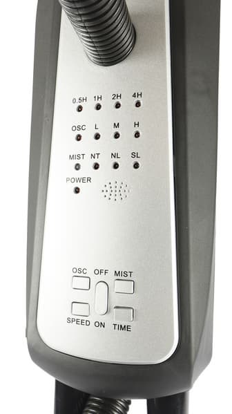 Сзади у прибора располагается наклейка с технической информацией. Тут же мы видим провод питания и электрический провод, соединяющий основной блок с модулем увлажнителя. Специальных приспособлений для крепления проводов (или для того, чтобы их можно было спрятать) не предусмотрено. Пожалуй, это единственная наша претензия к внешнему виду вентилятора.