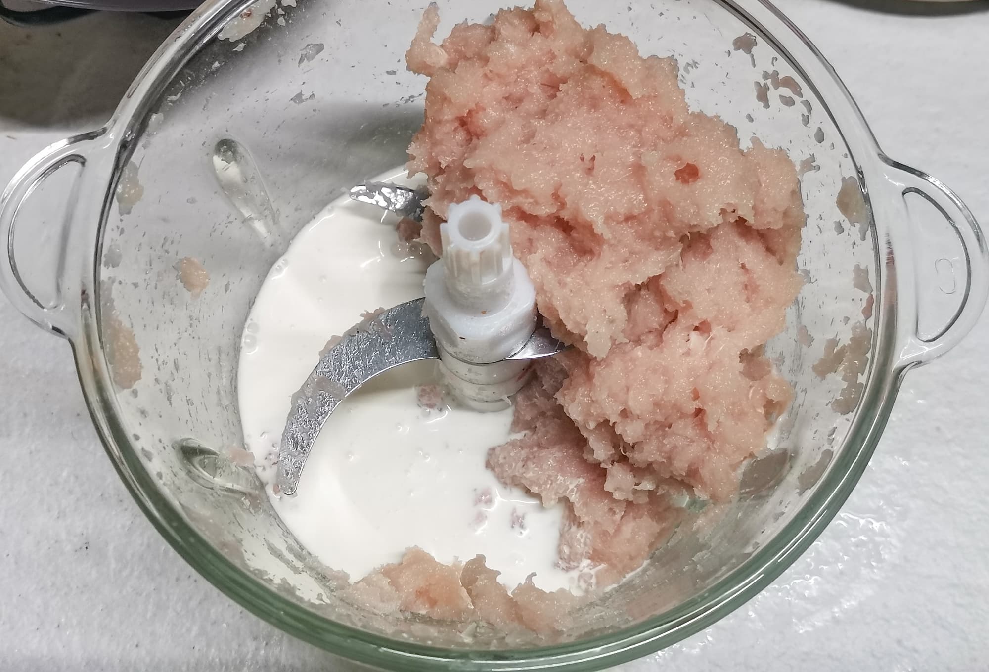 Мы взяли куриную грудку, нарезали крупными кусками, положили в емкость около 400 г и измельчали в течение 15 секунд.